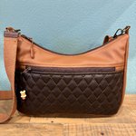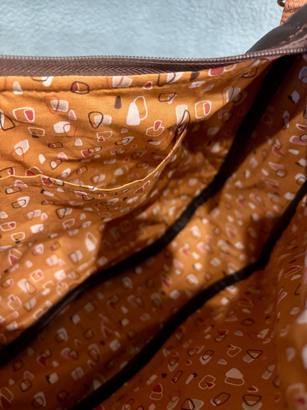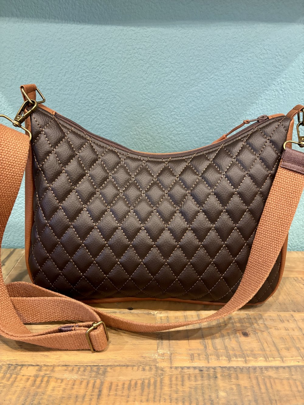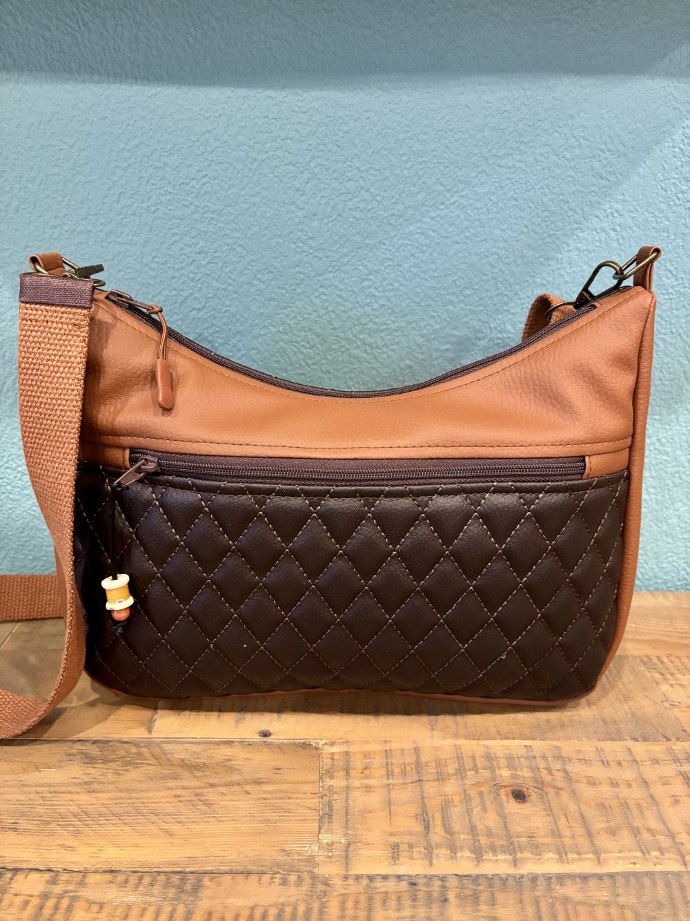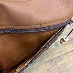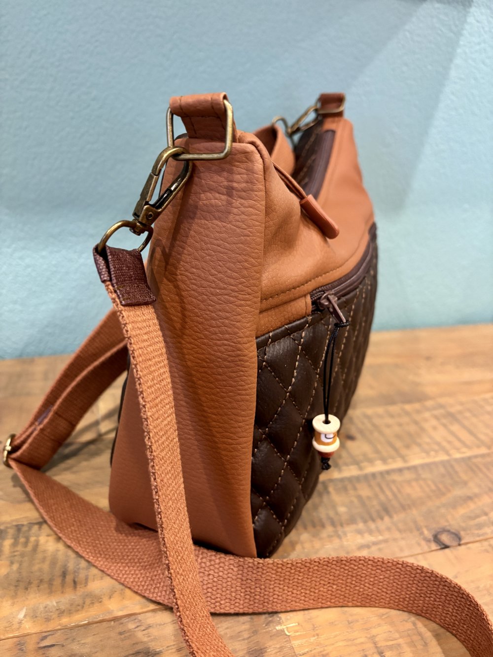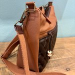 Sac bandoulière en toile enduite camel et marron pour l'extérieur, cotonnade pour l'intérieur, fermé par une fermeture éclair