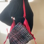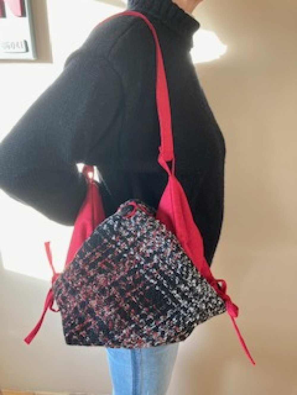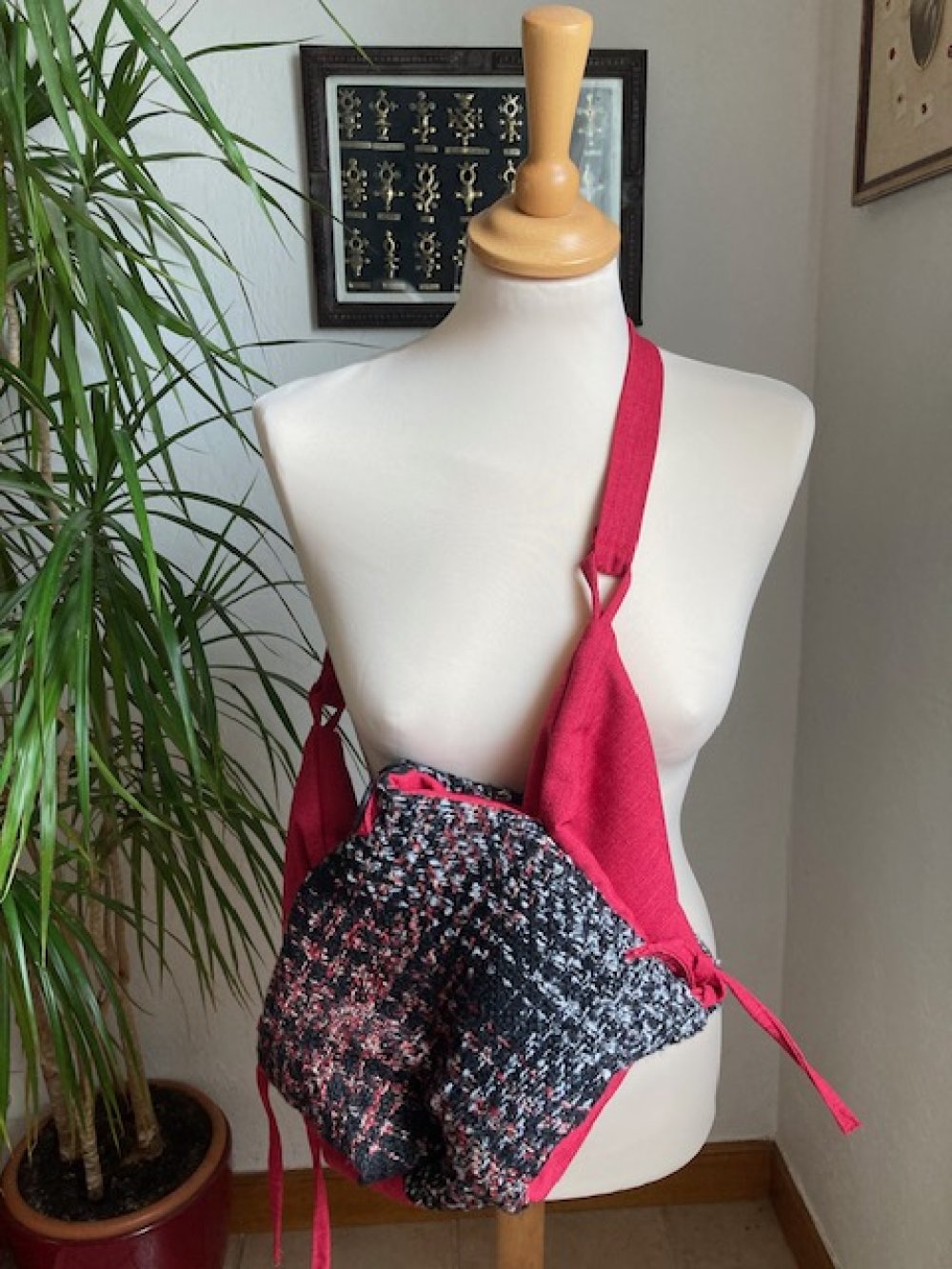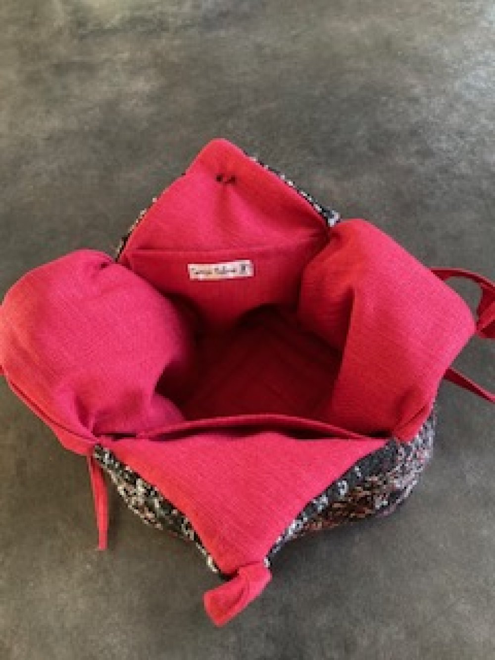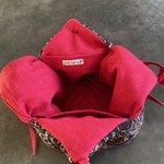 Un sac en tissu style jean imprimé d'une forme rigolote, entièrement doublé en toile de Jouy beige et rose avec 2 poches intérieures. Les liens sur le côté peuvent se défaire pour avoir encore plus de volume. Chaque modèle est unique.