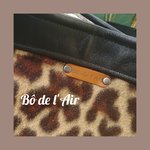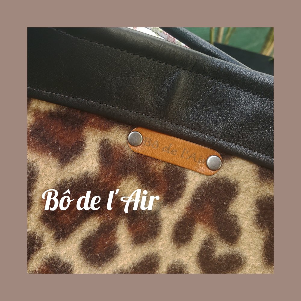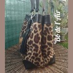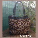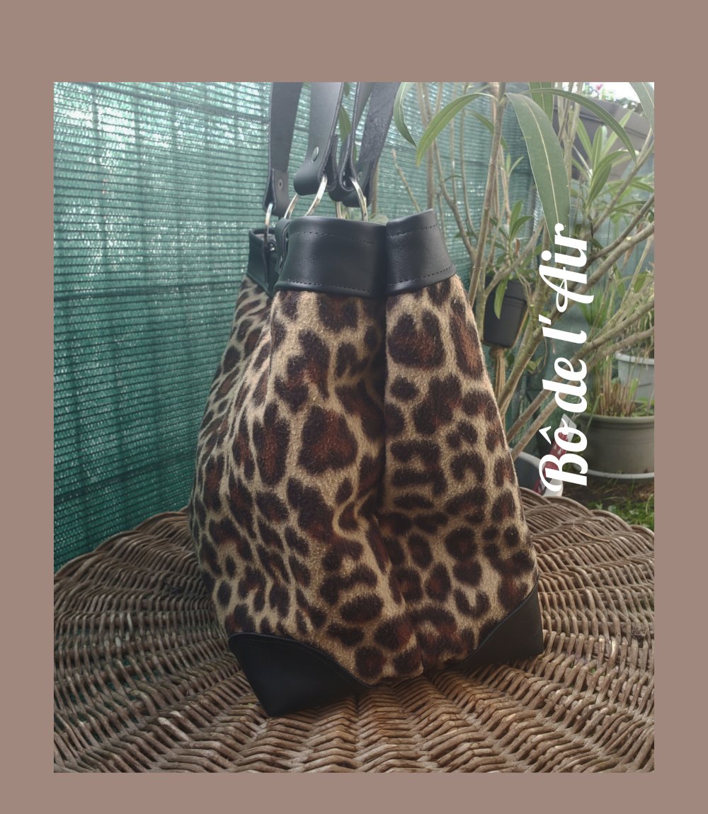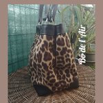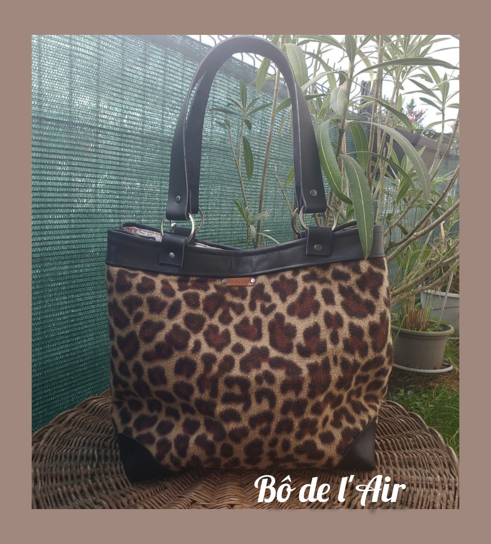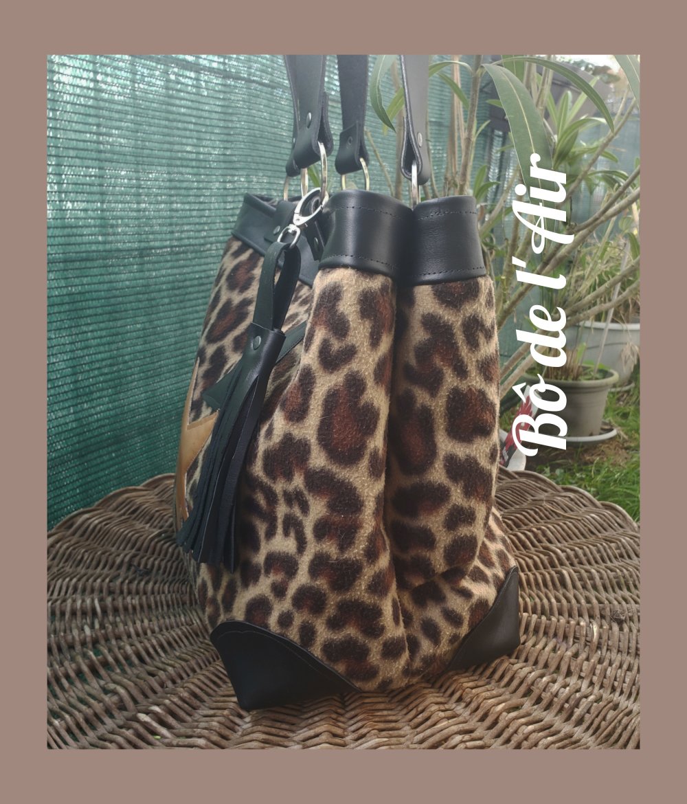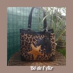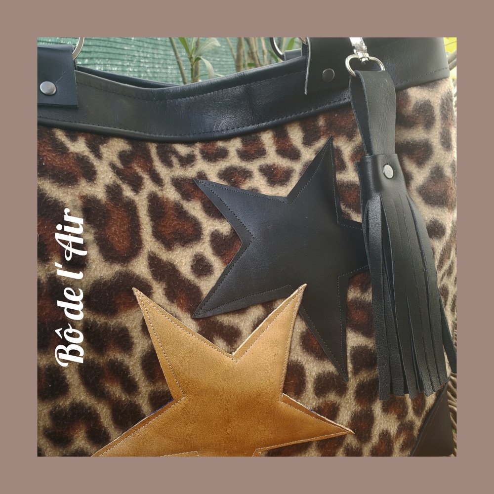 Sac cabas confectionné à partir de flanelle de laine léopard, revalorisé, entoilée pour davantage de tenue, mixée avec du cuir noir pour le haut et les coins du sac, cuir provenant de stock dormant d'une ancienne sellerie. Une étoile en cuir noir et une autre en cuir beige , cousues sur le devant du sac .