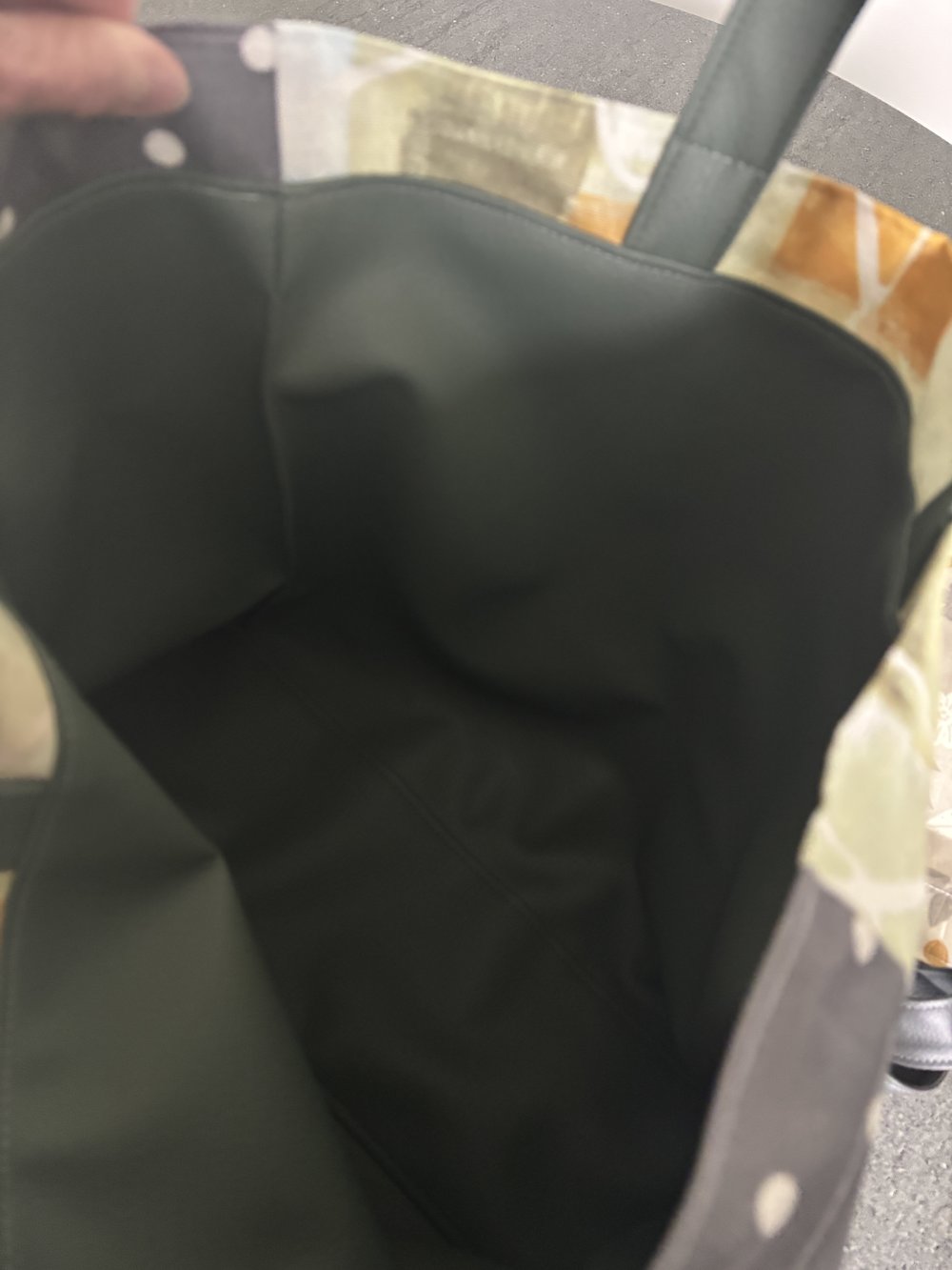Sac cabas ou sac fourre-tout en simili, imprimé pour l'extérieur et doublé uni pour l'intérieur.
