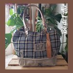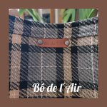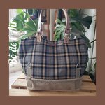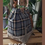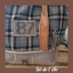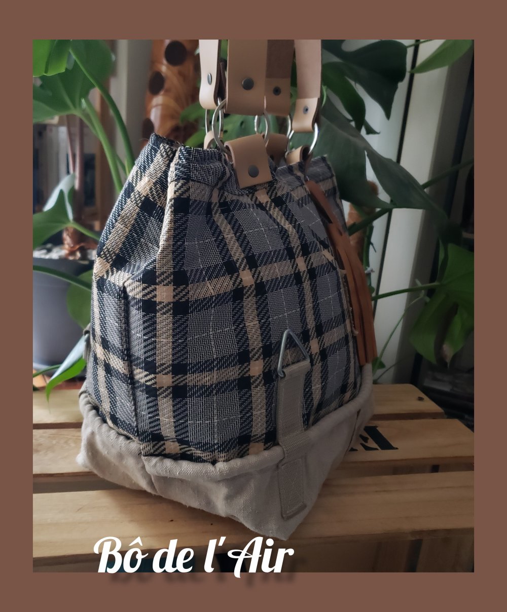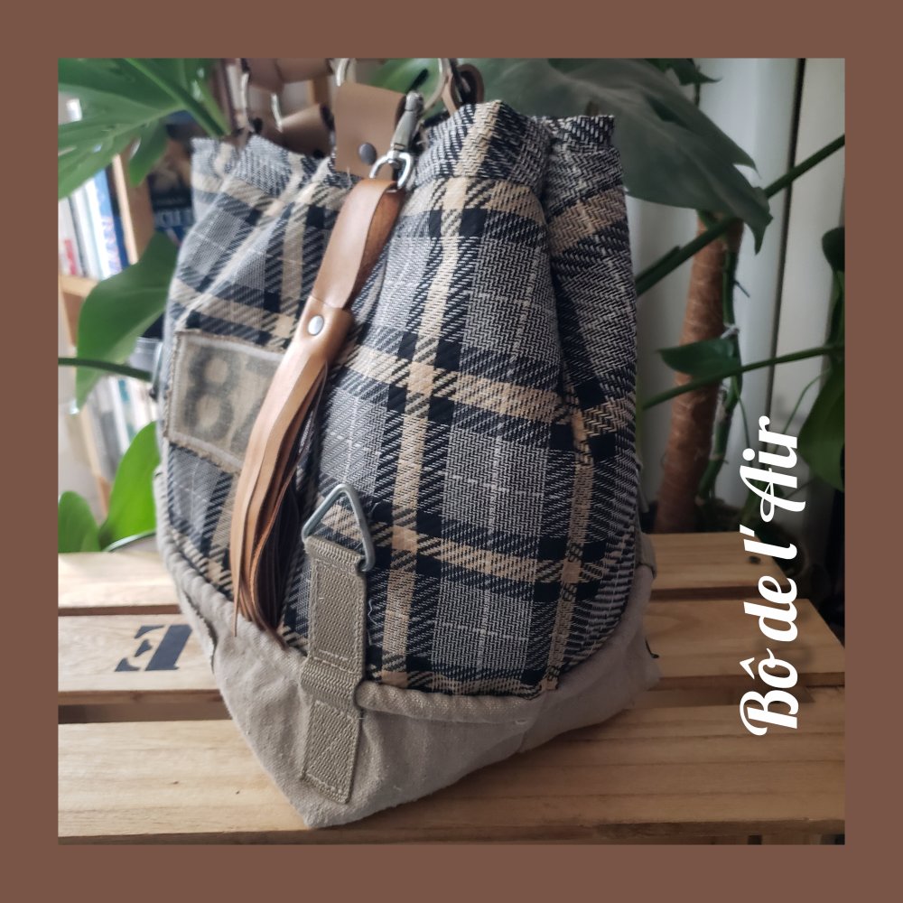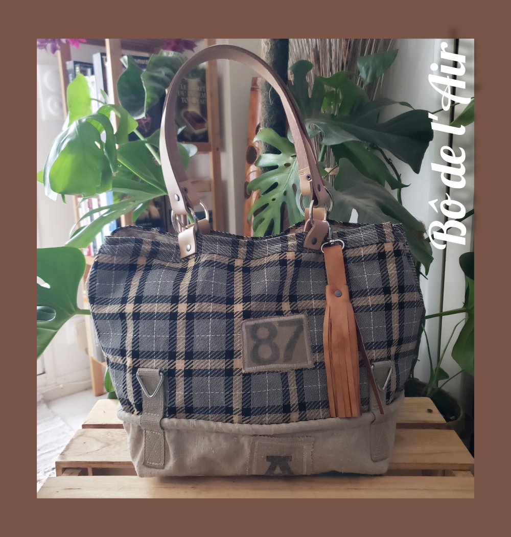 Sac cabas tissu lainage tartan noir, gris, beige, revalorisé et entoilé pour davantage de tenue, mixé pour le bas du sac avec une belle toile beige provenant d'un ancien sac postal, avec ses accroches, empiècements "87" et lettre "A", provenant de toile postale, cousus sur le devant du sac.