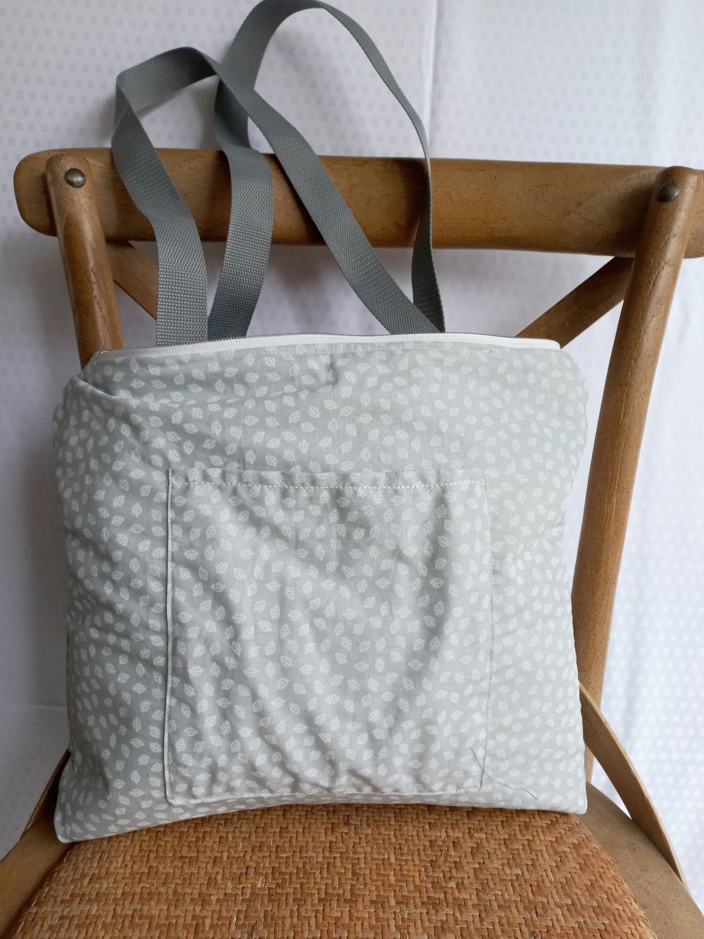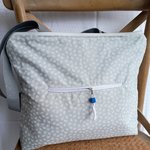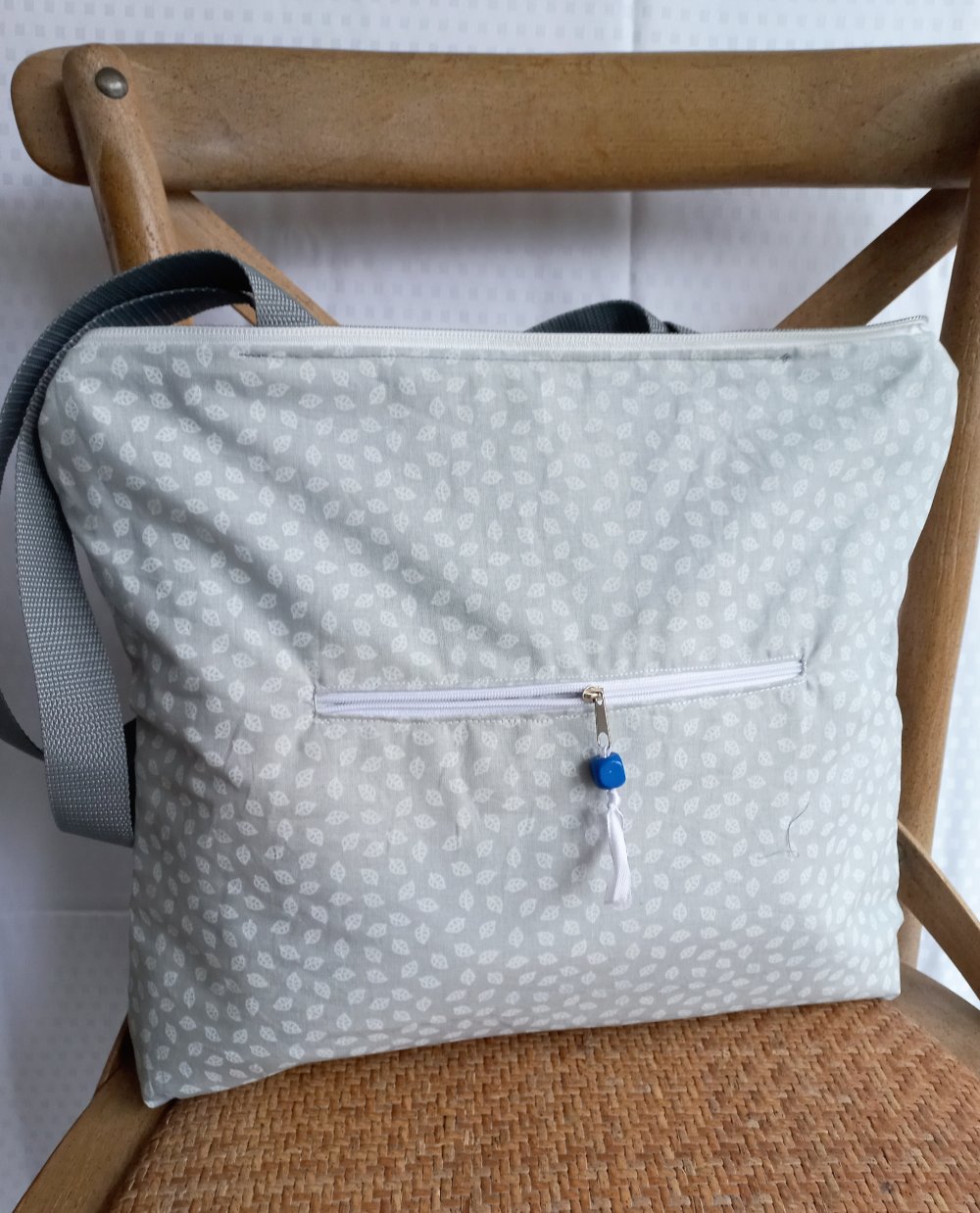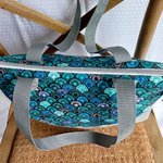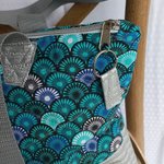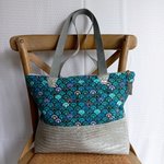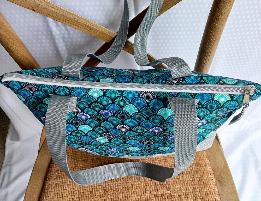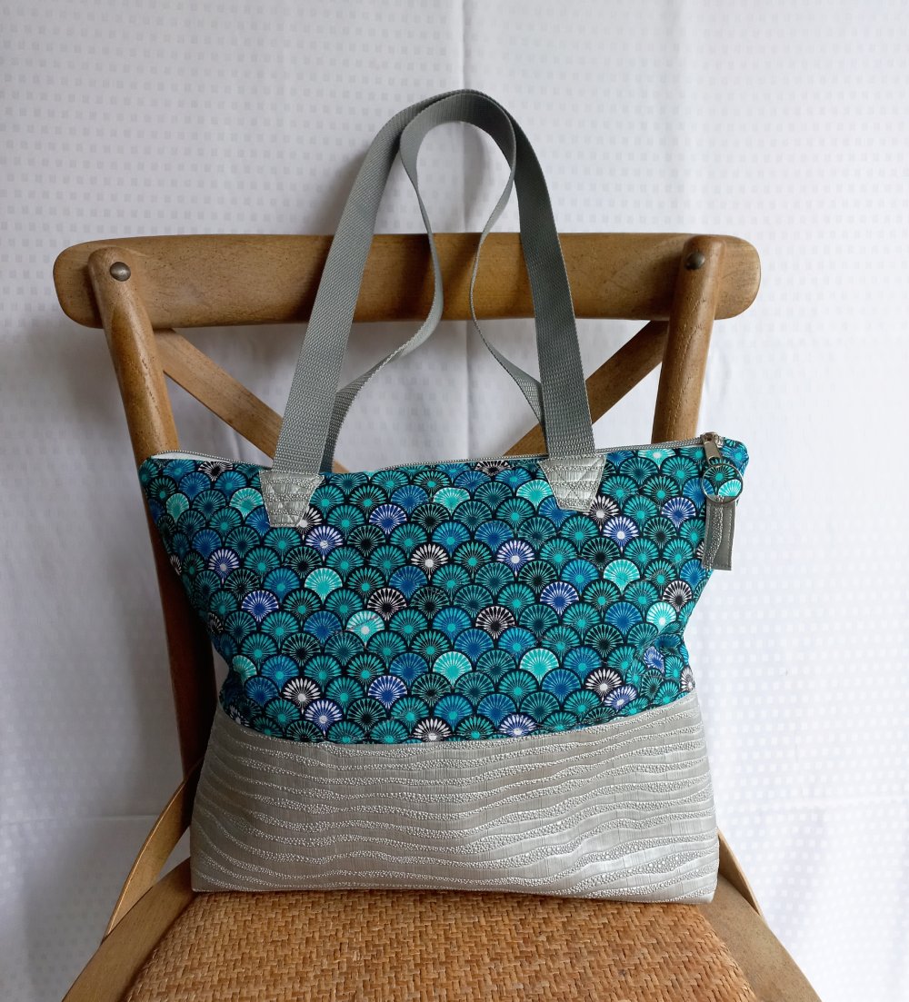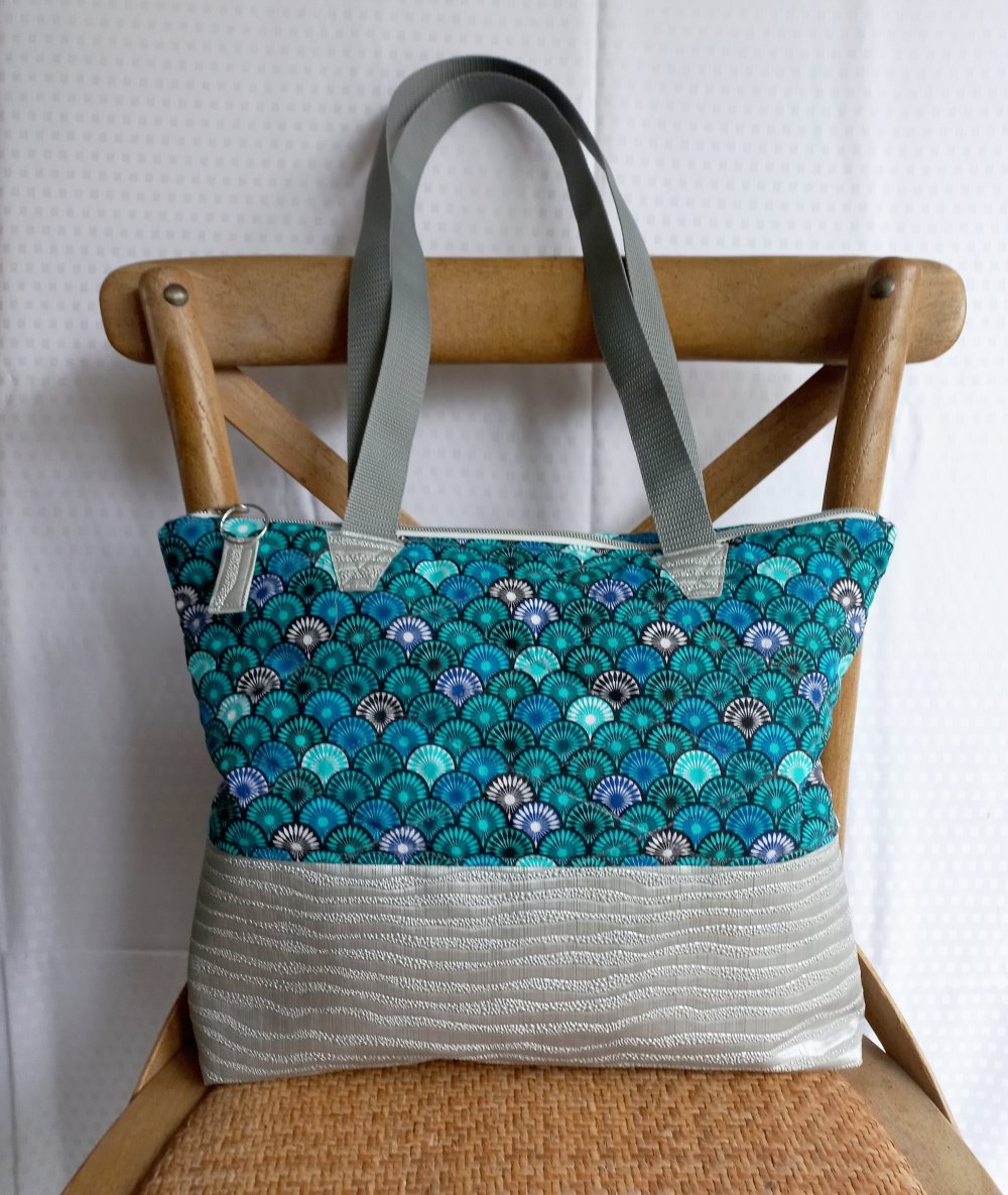 Sac cabas port a l'épaule,tissu motifs éventails bleus,simili cuir argenté, doublée,poche zippée et poche plaquée