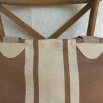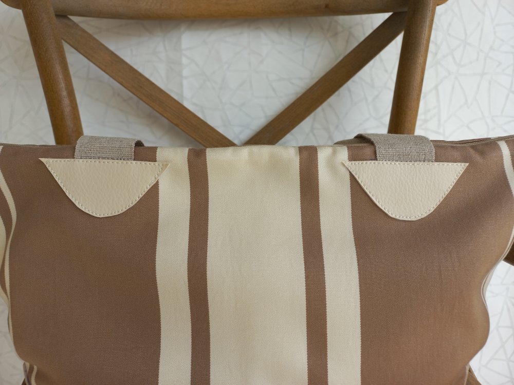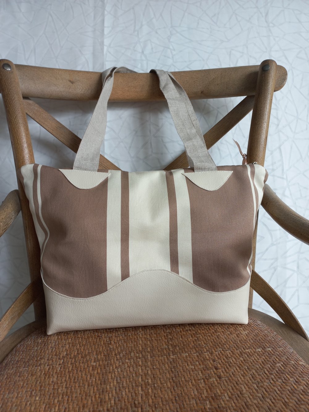 sac ou cabas en toile rayée beige et écrue, montée sur une base de simili cuir beige en forme de vague