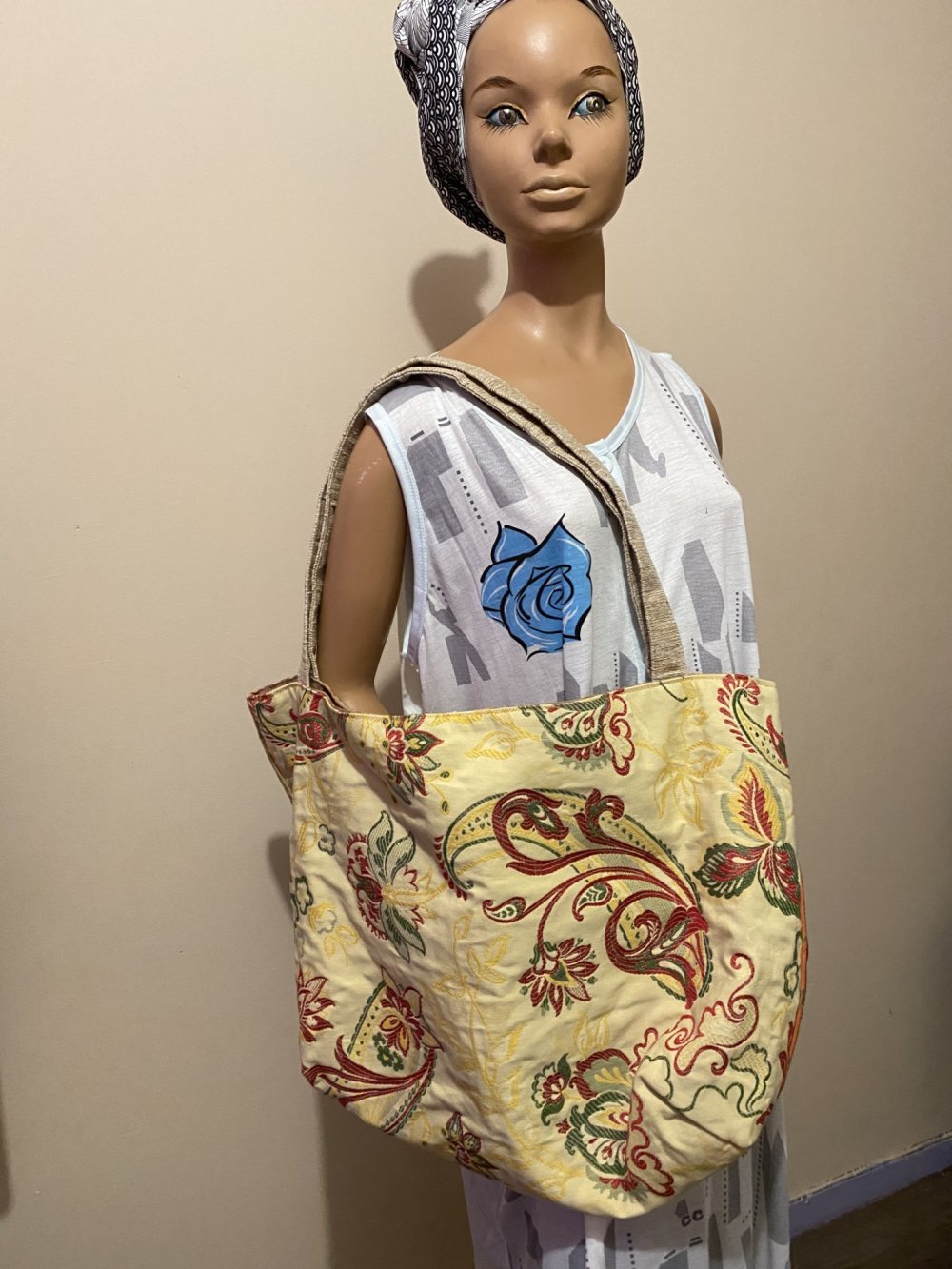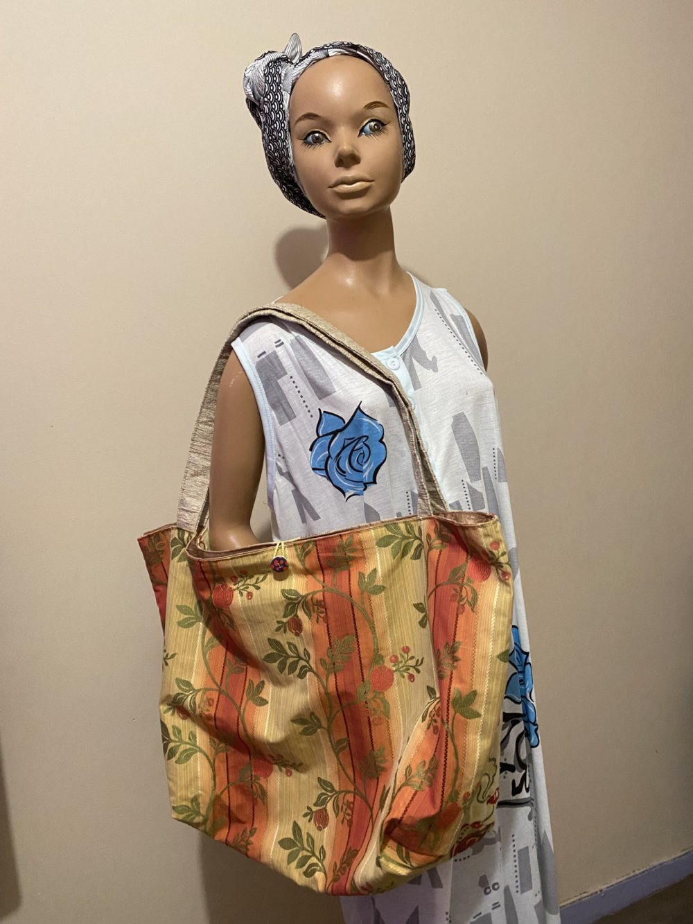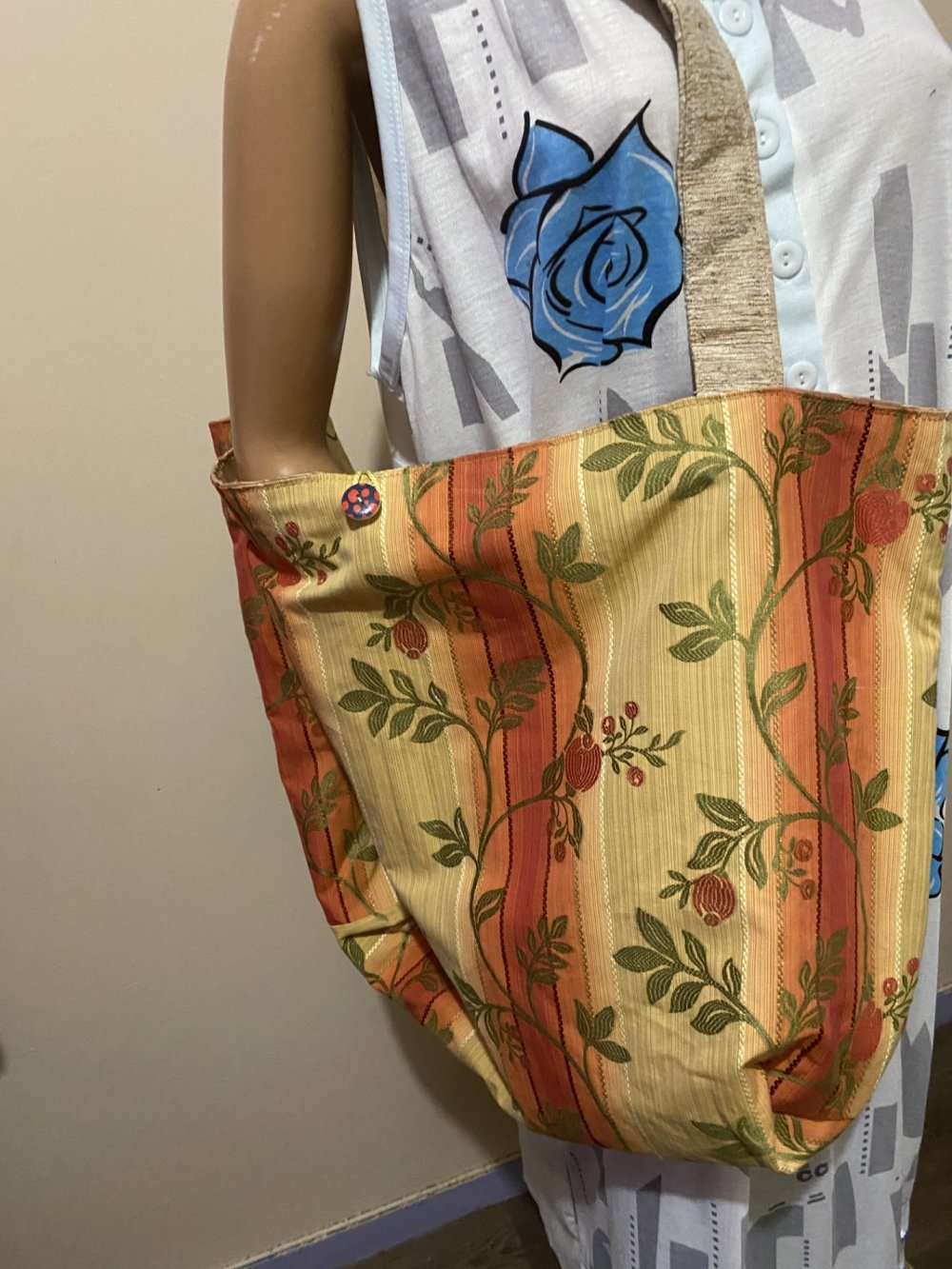 A tout moment, pour faire du shopping, aller au sport, partir en week-end, ce sac réversible (aussi cabas) de 60 cms x 39 cms de hauteur est réalisé avec chaque coté différent de tissu en coton assez épais (5 premières photos constituent le sac)-