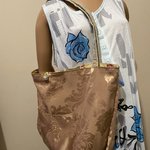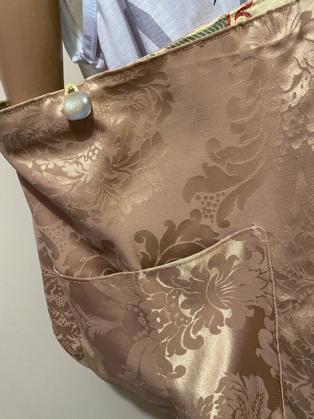 Vous pourrez porter ce sac à l'épaule ou à la main grâce à des anses d'environ 68 cms faites dans un tissu de coton beige. Se ferme avec 2 boutons de chaque coté du sac.