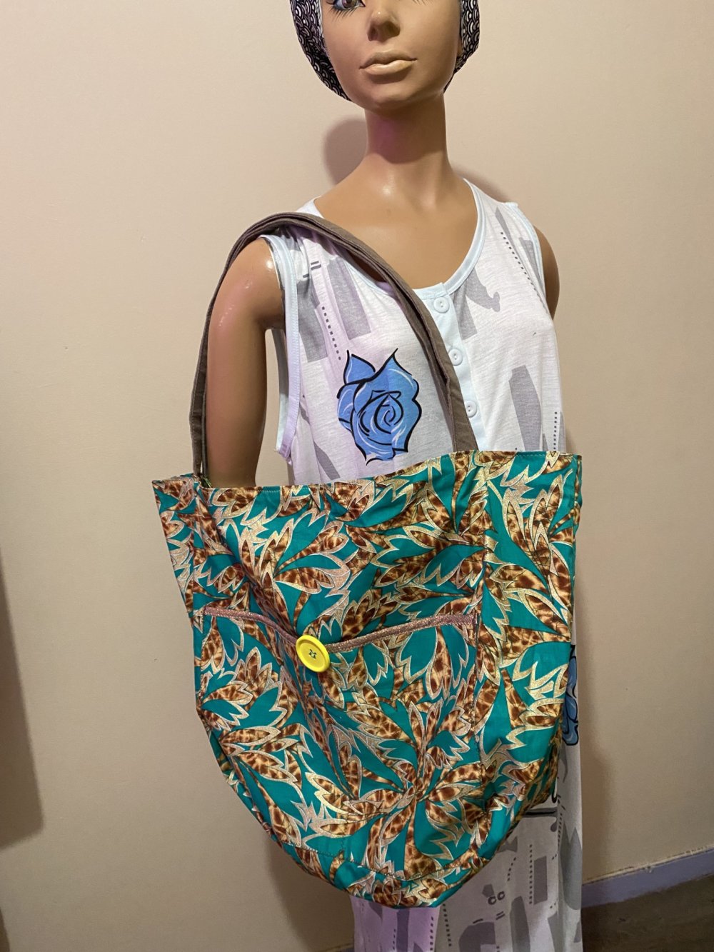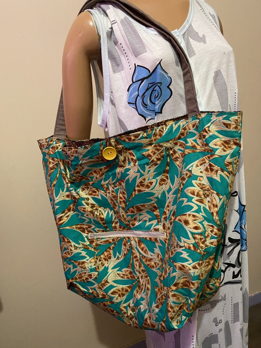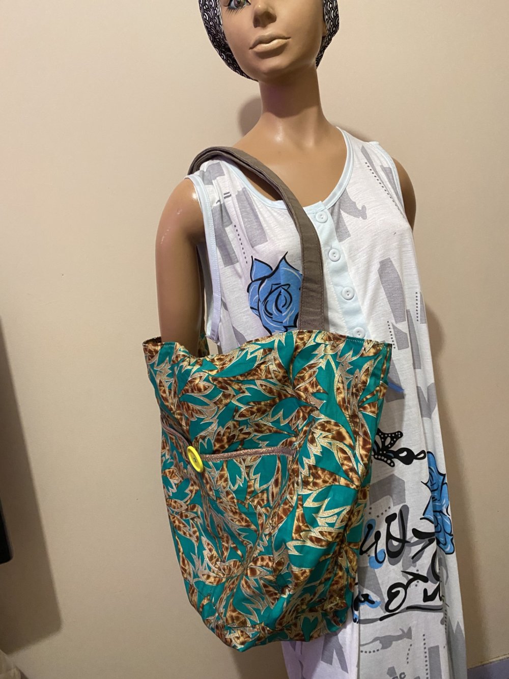 L'intérieur du sac ou extérieur - même tissu en coton/Wax dans les tons verts - (4 premières photos) avec poche intérieure et poche zippée sur chaque coté -