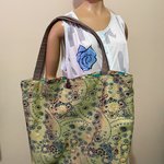 Vous pourrez porter ce sac à l'épaule ou à la main grâce à des anses d'environ 68 cms faites dans un tissu de coton couleur taupe. Se ferme avec 2 boutons de chaque coté du sac.