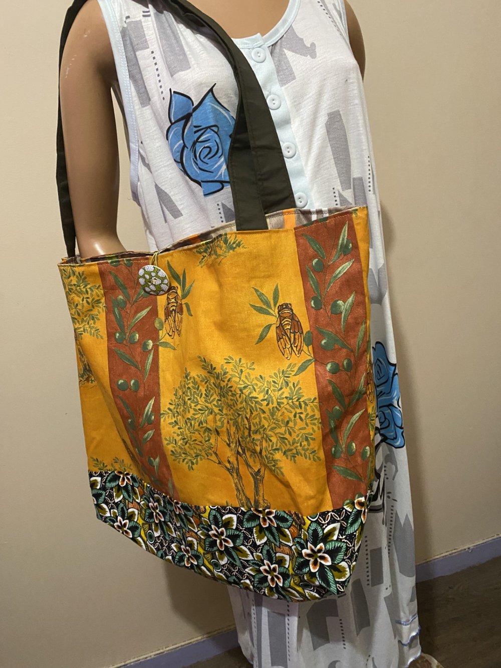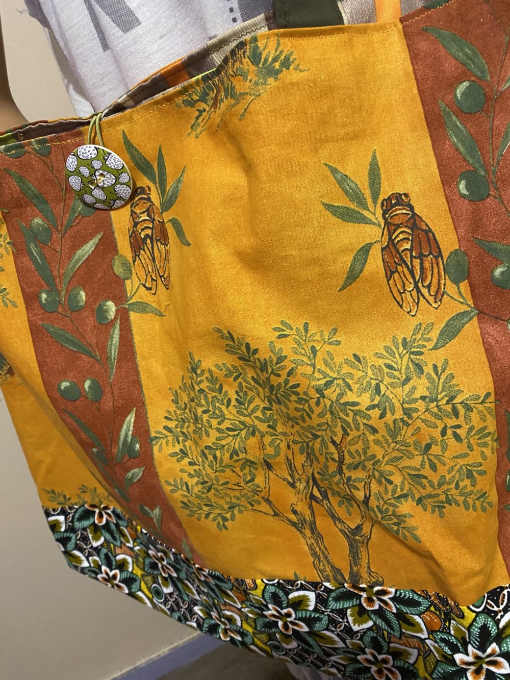 Pour faire du shopping, aller au sport, partir en week-end, ce Sac/Cabas - de 40 cms hauteur x 57 cms largeur - est réalisé dans un tissu provençal en coton assez épais et résistant, ton orange pour les 2 cotés du sac - (2 premières photos) - le fond du sac avec un autre tissu en coton wax.