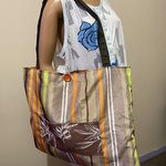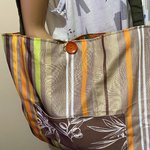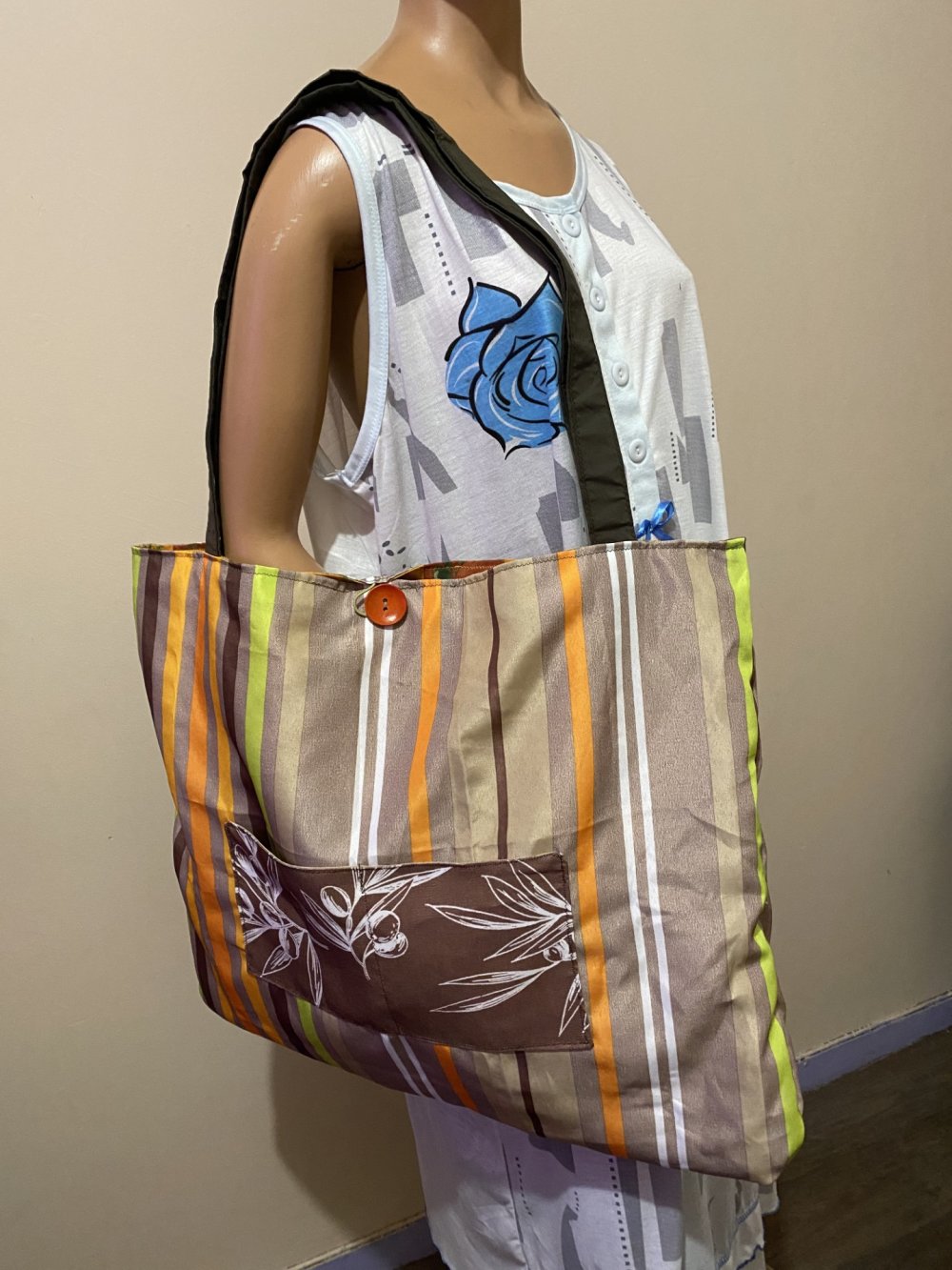 Le sac peut se porter de deux façons car réversible - se ferme avec 2 boutons cousus des 2 cotés du sac.