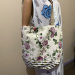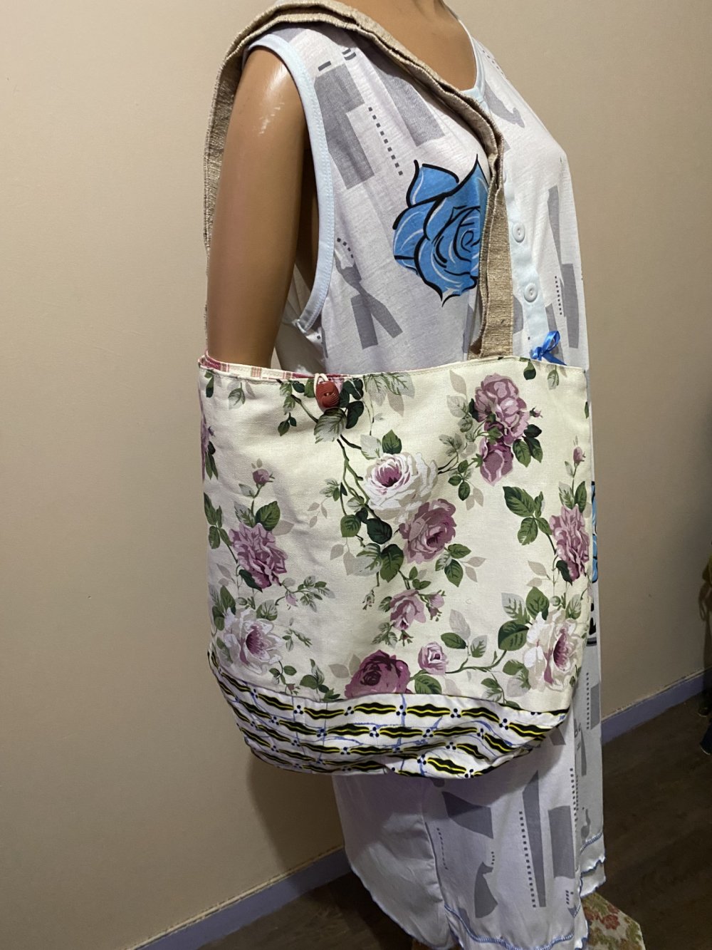 Vous pourrez porter ce sac à l'épaule ou à la main grâce à des anses d'environ 70 cms faites dans un tissu de coton couleur beige. Se ferme avec 2 boutons de chaque coté du sac.