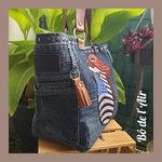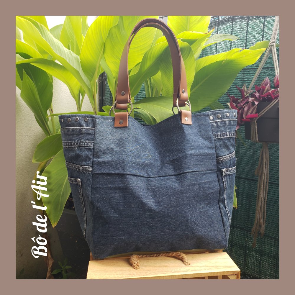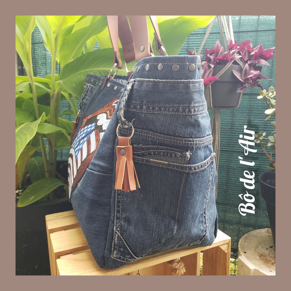 Sac cabas toile de jean bleu denim, revalorisée, entoilée pour davantage de tenue, grand écusson sequins, bouche , langue drapeau anglais, cousu sur le devant du sac, rivets sur le haut du sac (devant et côtés), une poche sur chacun des côtés, deux pompons de 7,5 cm, en cuir ancien cognac, sur chacun des côtés, rivetés sur anneaux de porte-clé.