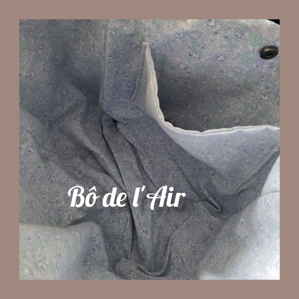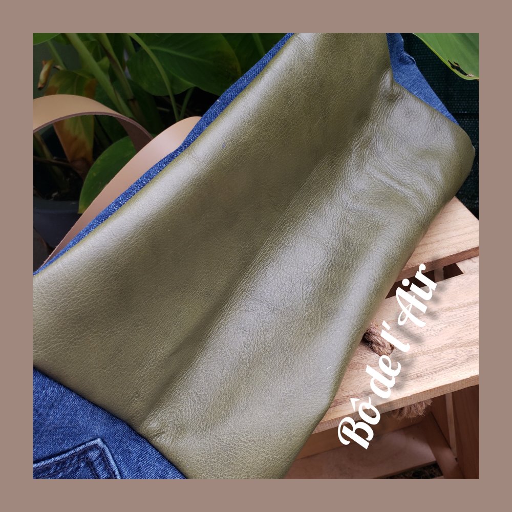 Entièrement doublé avec un tissu de coton ancien fleuri , ton bleu ciel, une poche intérieure et fermoir magnétique. Anses en cuir lisse alezan, rivetées sur anneaux de renfort en acier. Fond du sac en cuir ancien kaki.