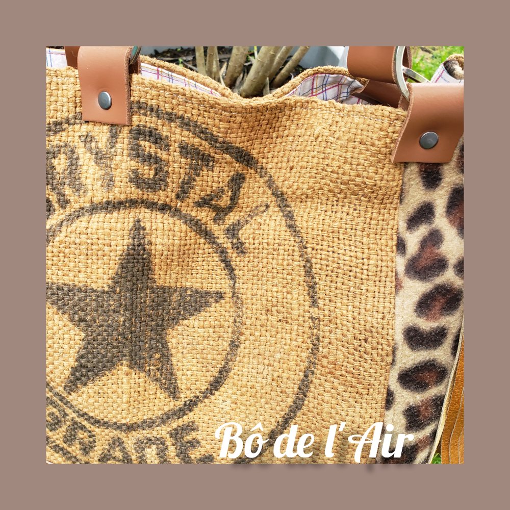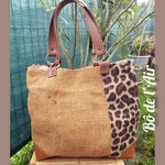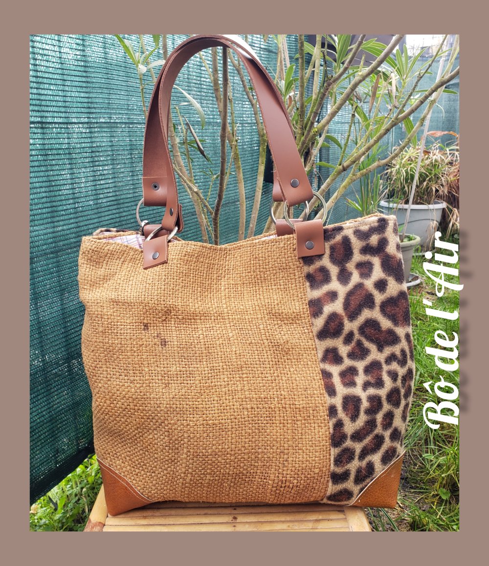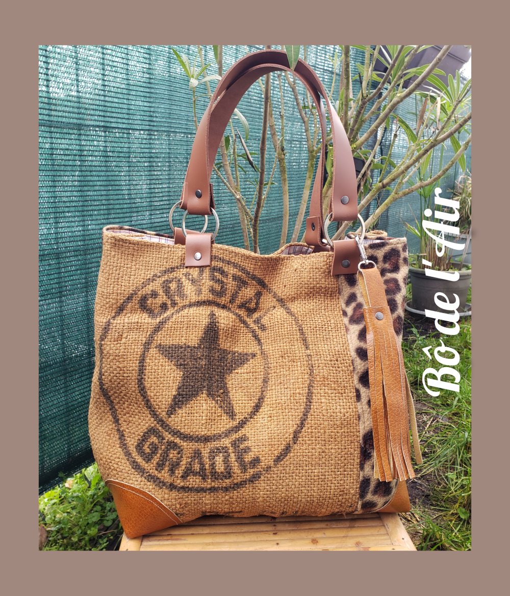 Sac cabas toile de jute vintage, "Crystal Grade", motif étoile, mixée avec du tissu flanelle de laine léopard, revalorisés, coins du sac renforcés avec du cuir grainé alezan revalorisé. Le sac est entoilé pour davantage de tenue, et doublé avec un tissu ancien beige et rayures, poche intérieure et fermoir magnétique. Anses en cuir lisse alezan, rivetées sur anneaux de renfort en acier, pompon en cuir grainé alezan, revalorisé, amovible grâce à son mousqueton. Le pompon mesure 18 cm sans l'attache.