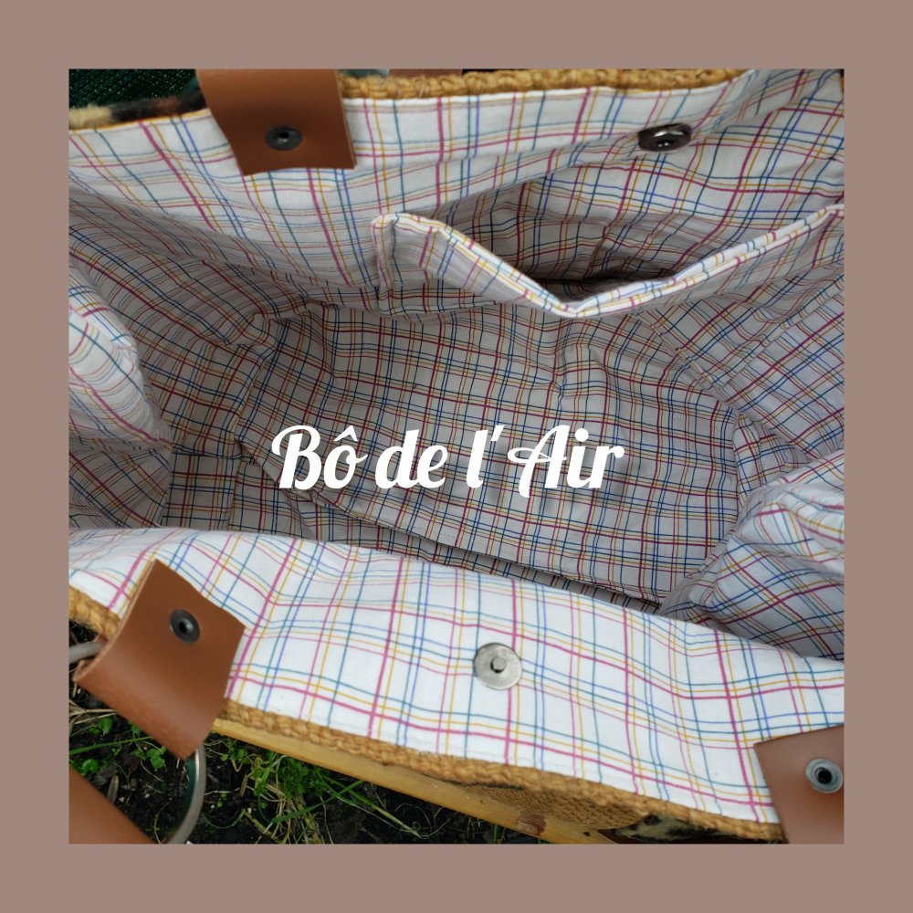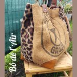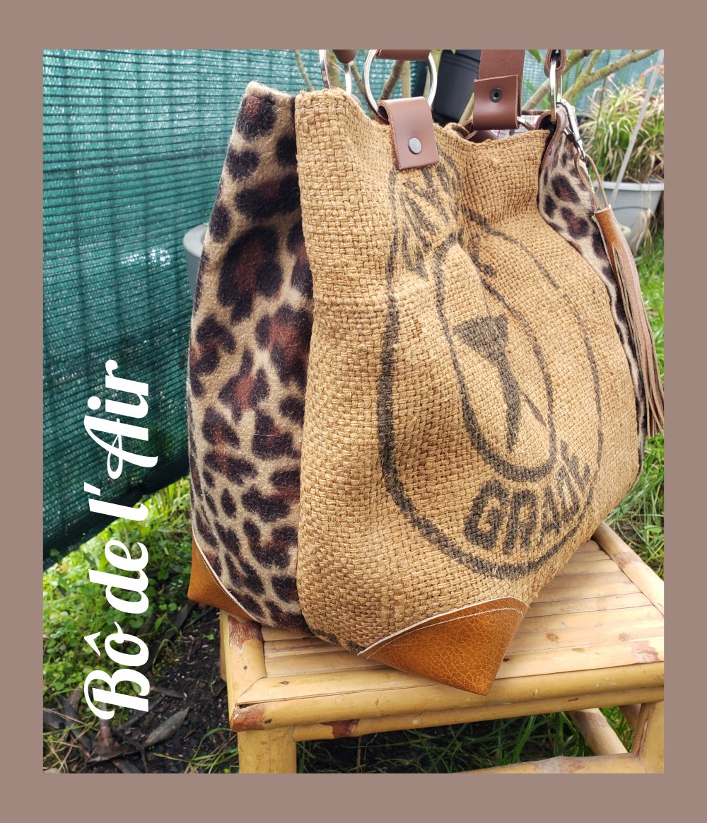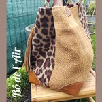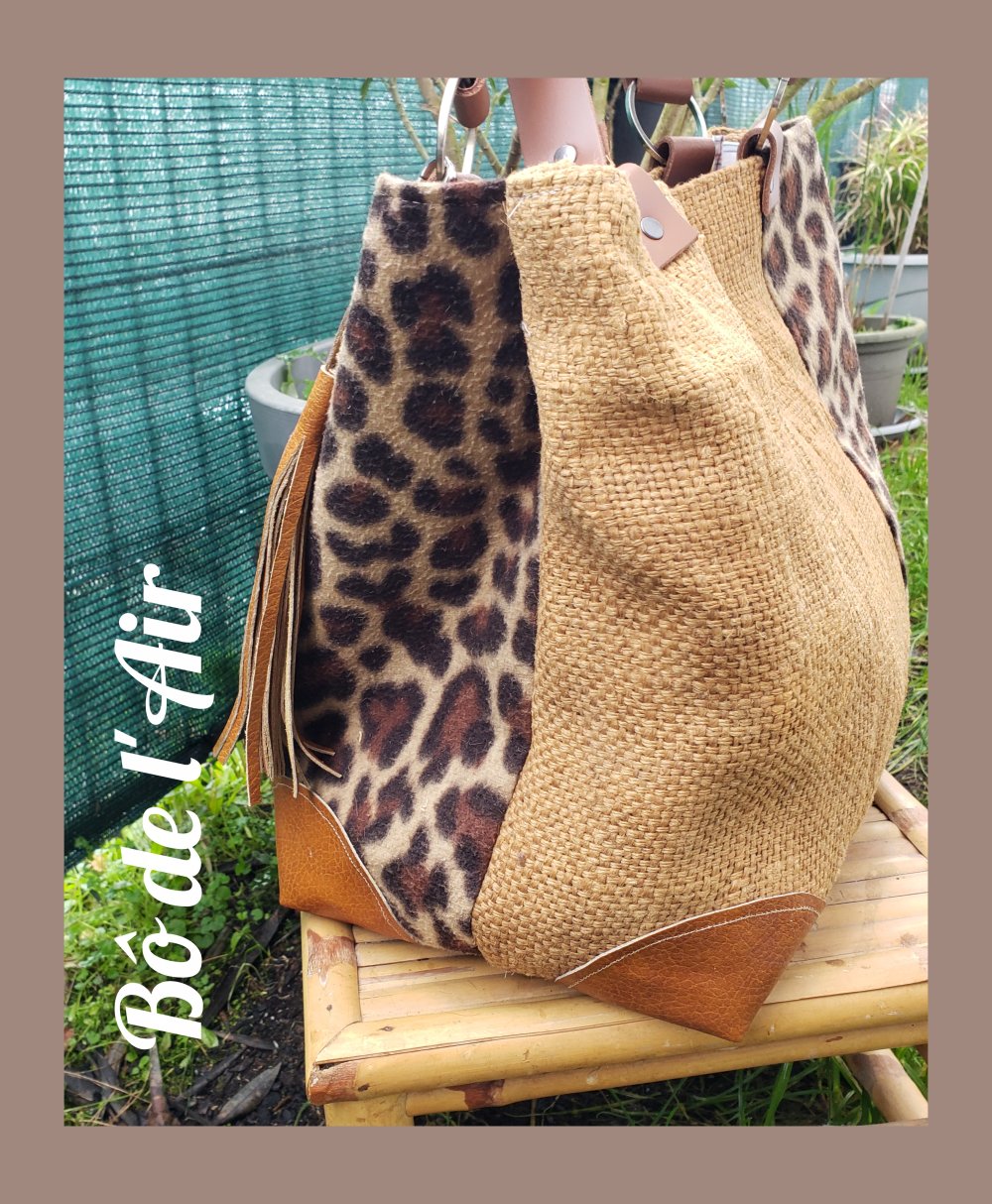 Sac cabas toile de jute vintage, "Crystal Grade", motif étoile, mixée avec du tissu flanelle de laine léopard, revalorisés, coins du sac renforcés avec du cuir grainé alezan revalorisé. Le sac est entoilé pour davantage de tenue, et doublé avec un tissu ancien beige et rayures, poche intérieure et fermoir magnétique. Anses en cuir lisse alezan, rivetées sur anneaux de renfort en acier, pompon en cuir grainé alezan, revalorisé, amovible grâce à son mousqueton. Le pompon mesure 18 cm sans l'attache.