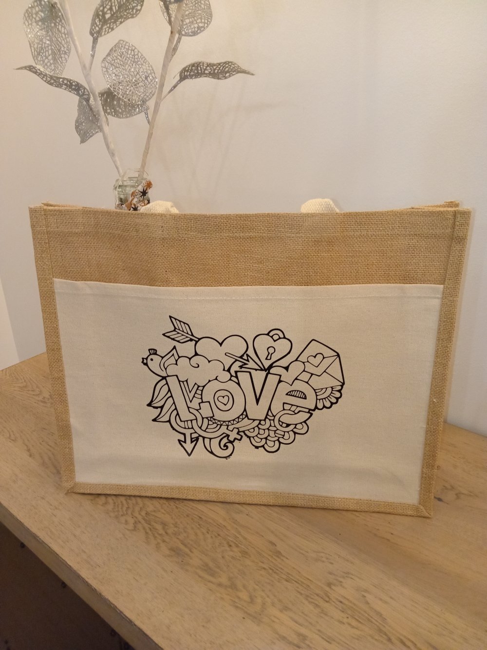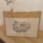 Grand sac cabas en jute personnalisé "love" avec une pochette en coton.