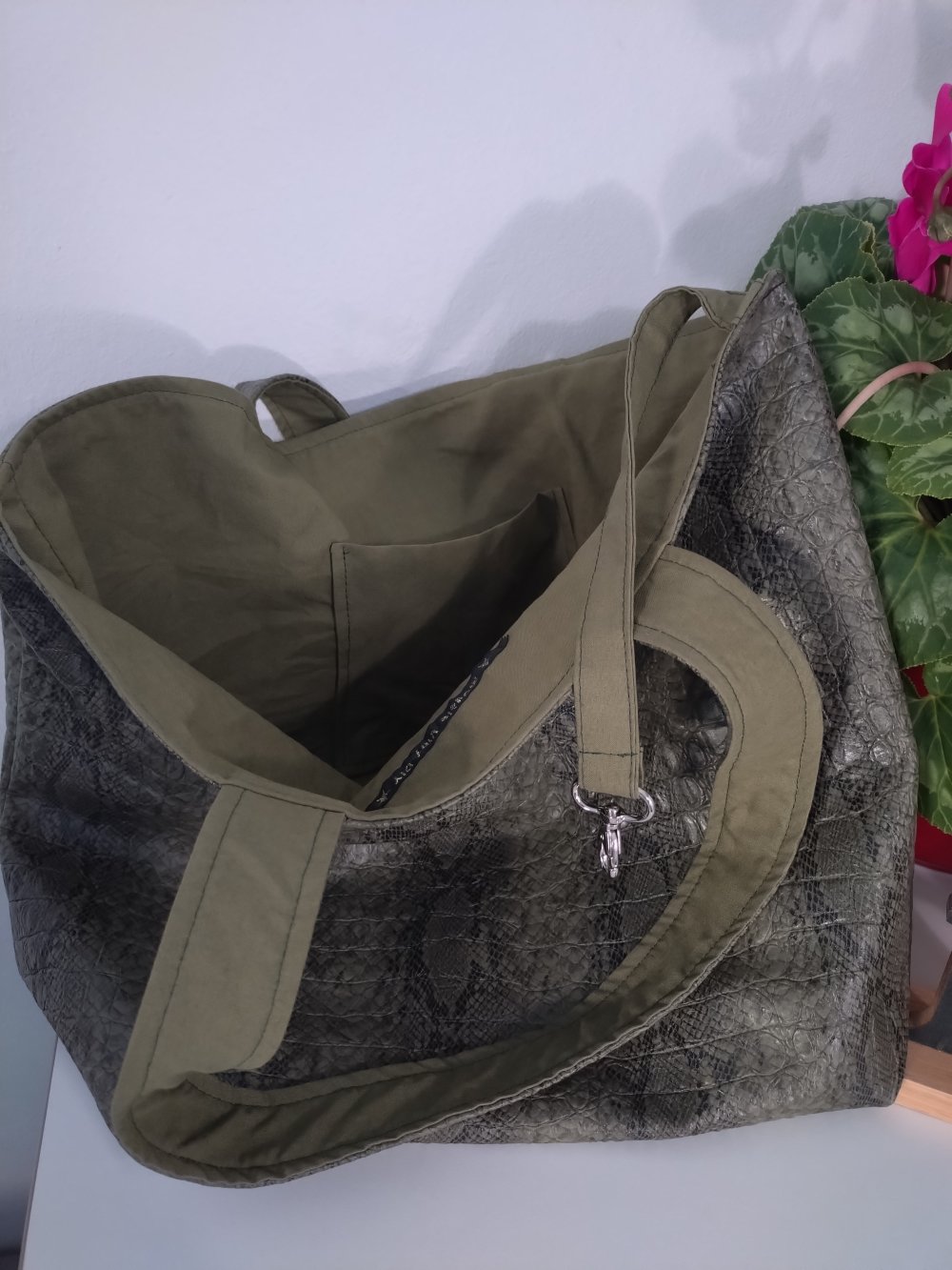 Simili cuir vert (extérieur) et coton uni kaki (intérieur)