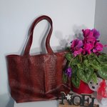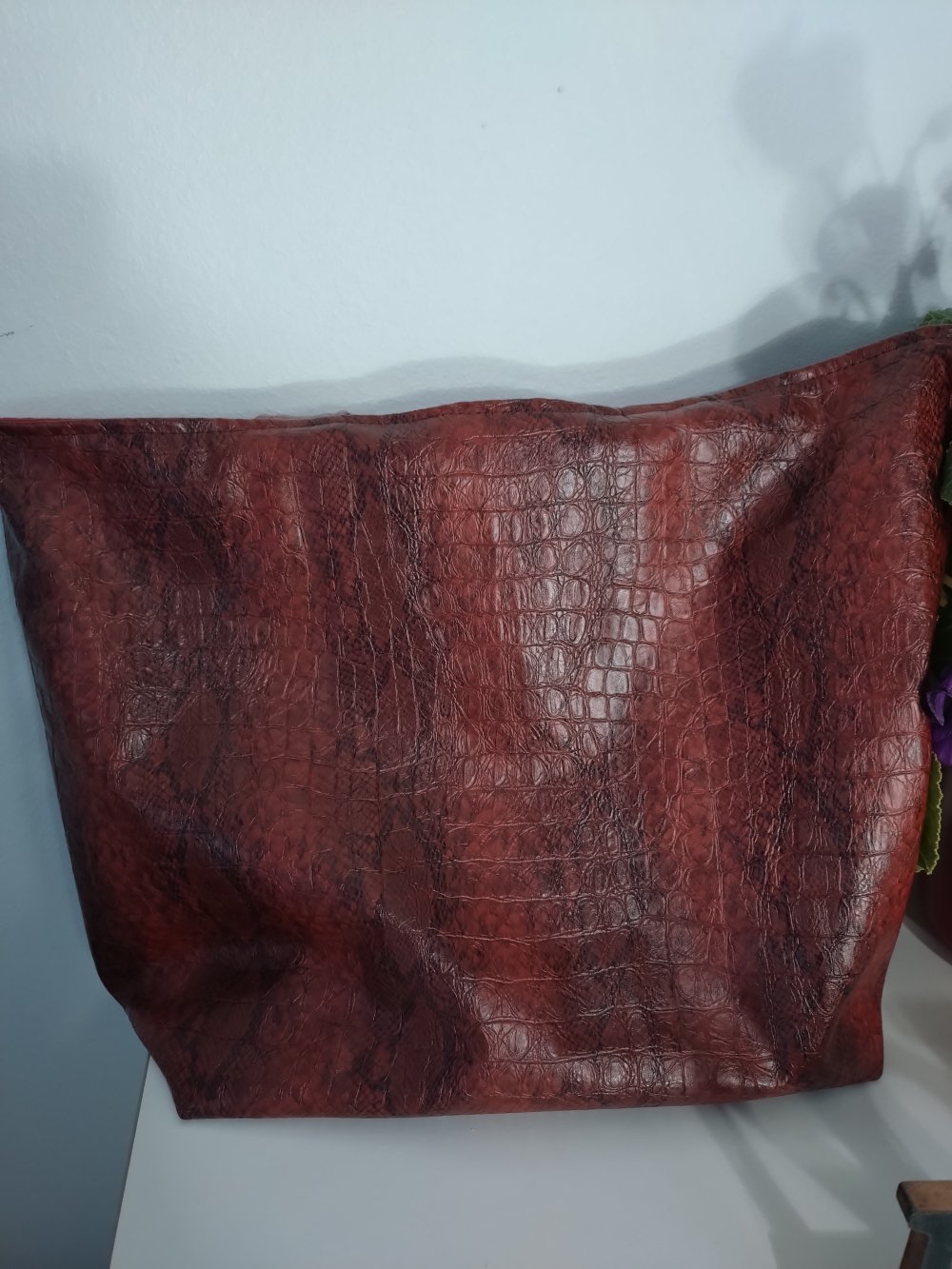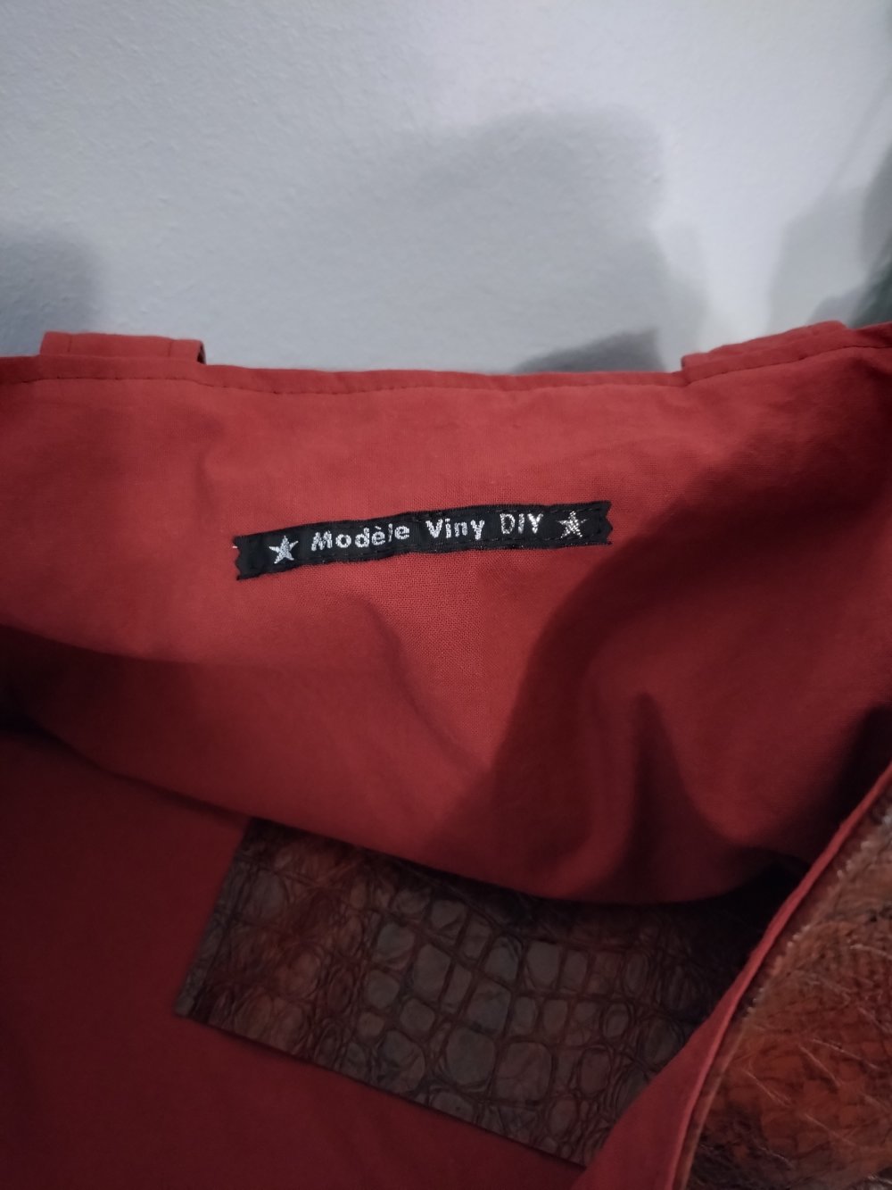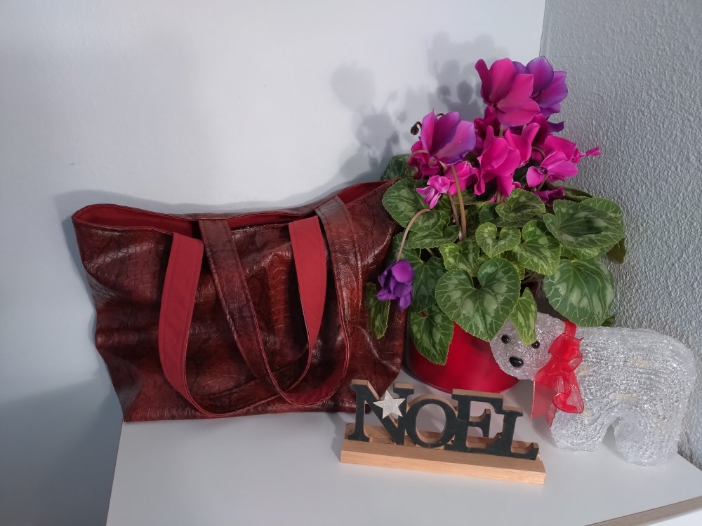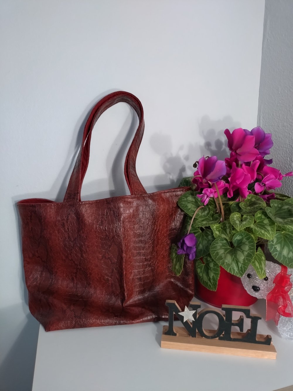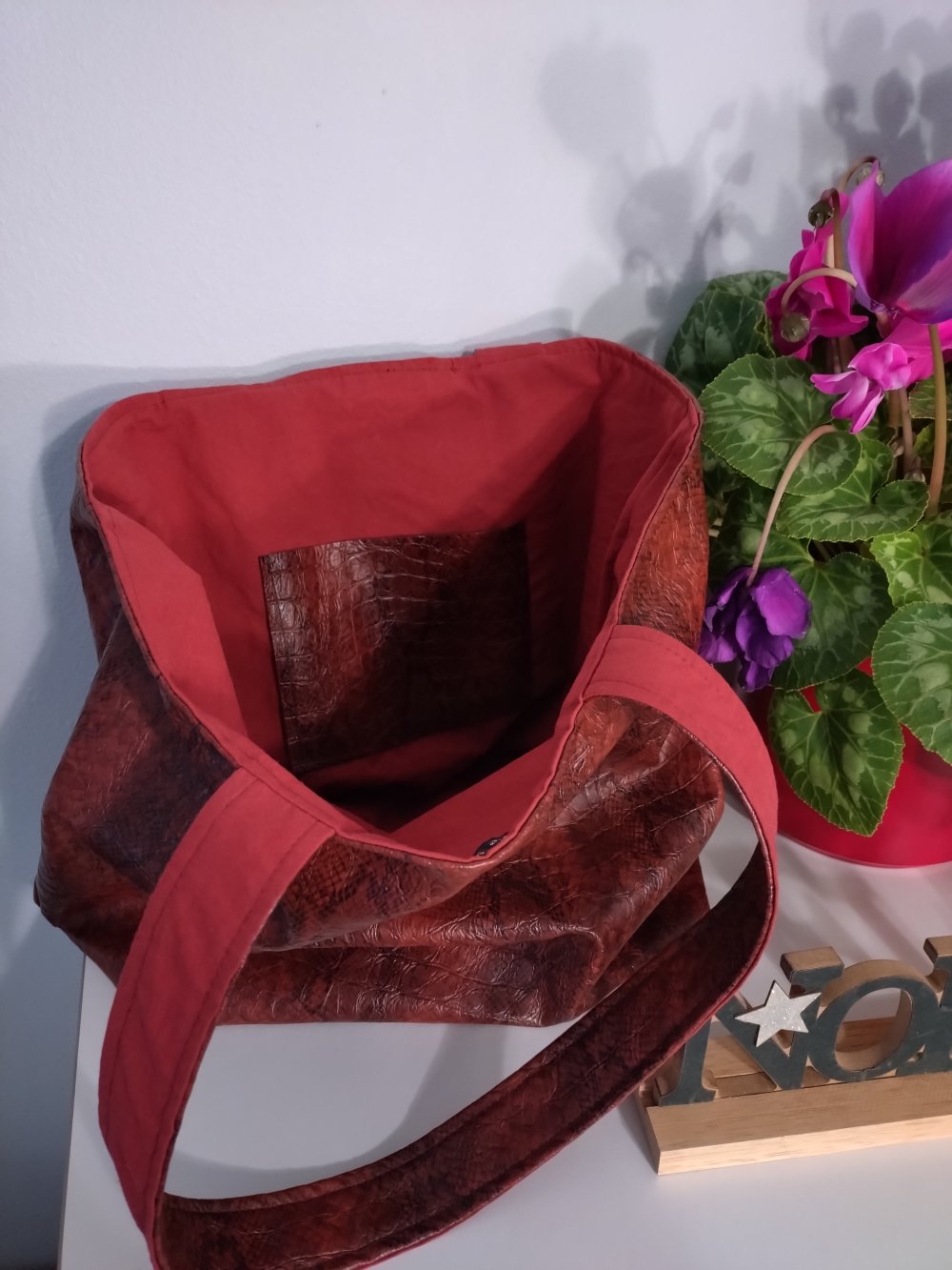 Simili cuir bordeau (extérieur) et coton uni rouge (intérieur)
