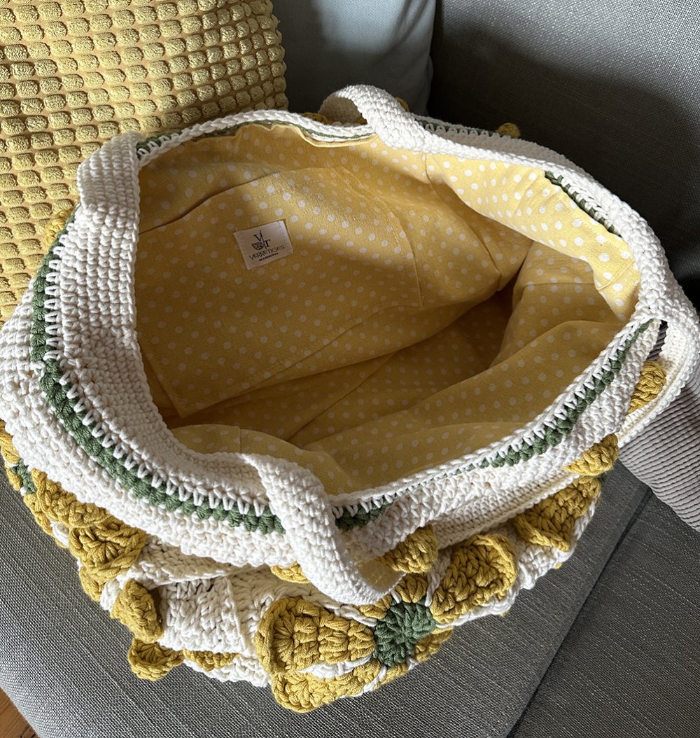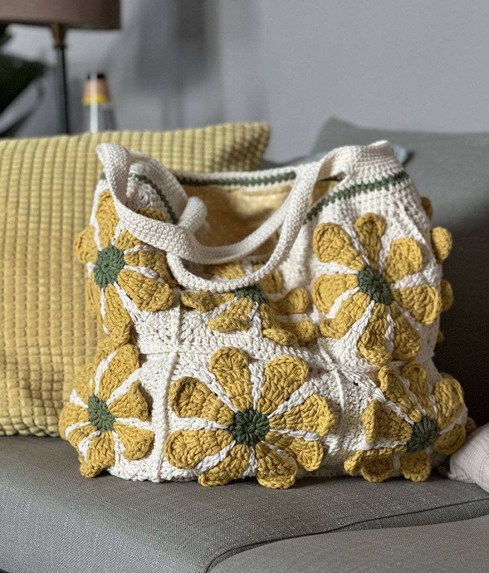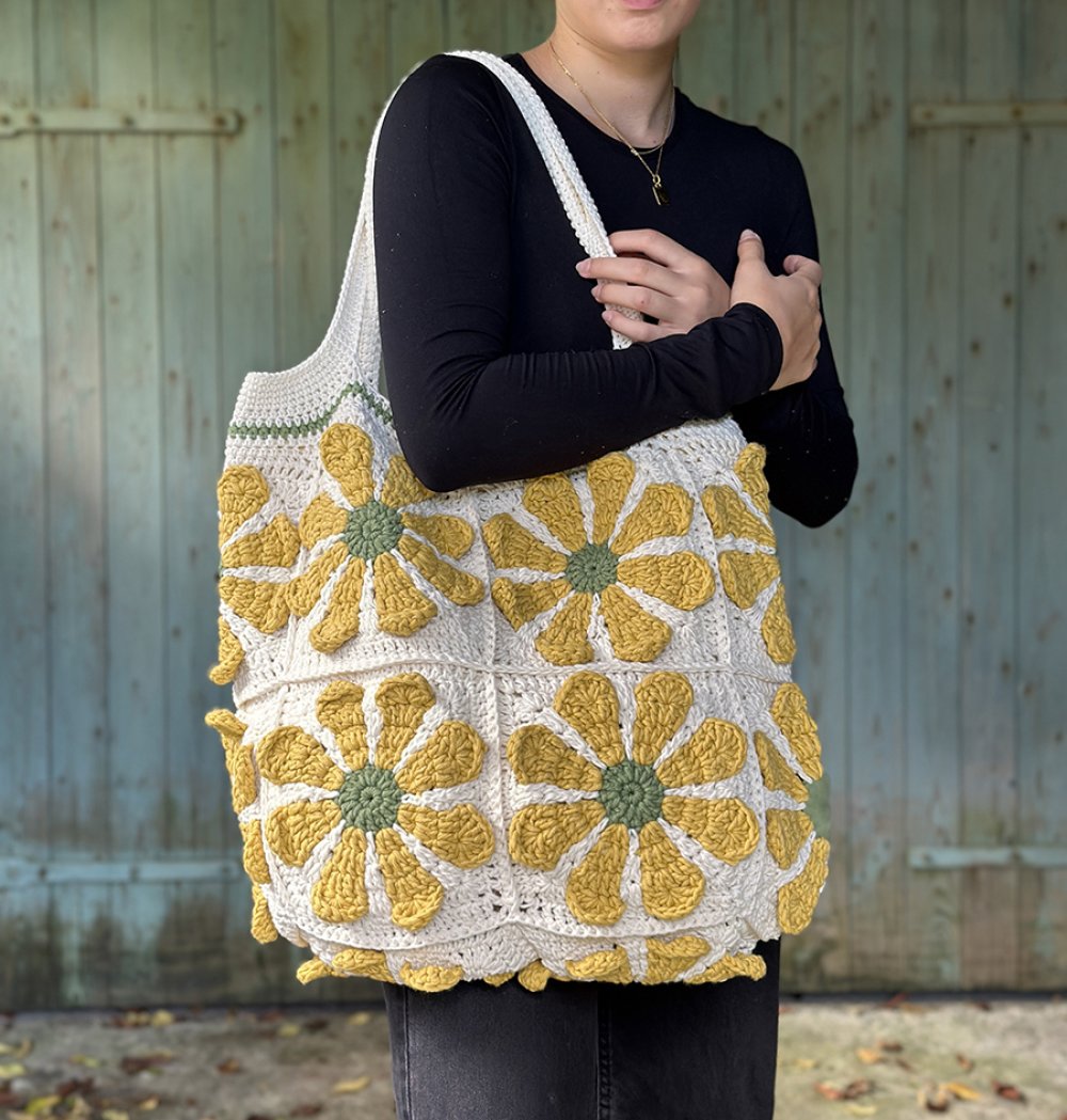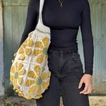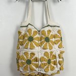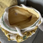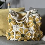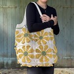 Sac grand format au crochet carré granny fleur dans un style vintage et bohème, écru et jaune, idée cadeau pour femme