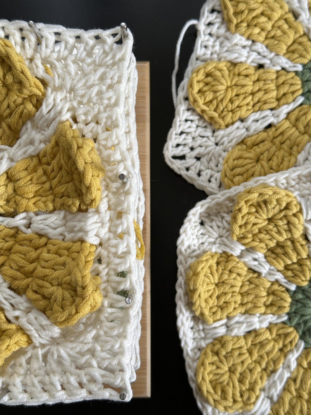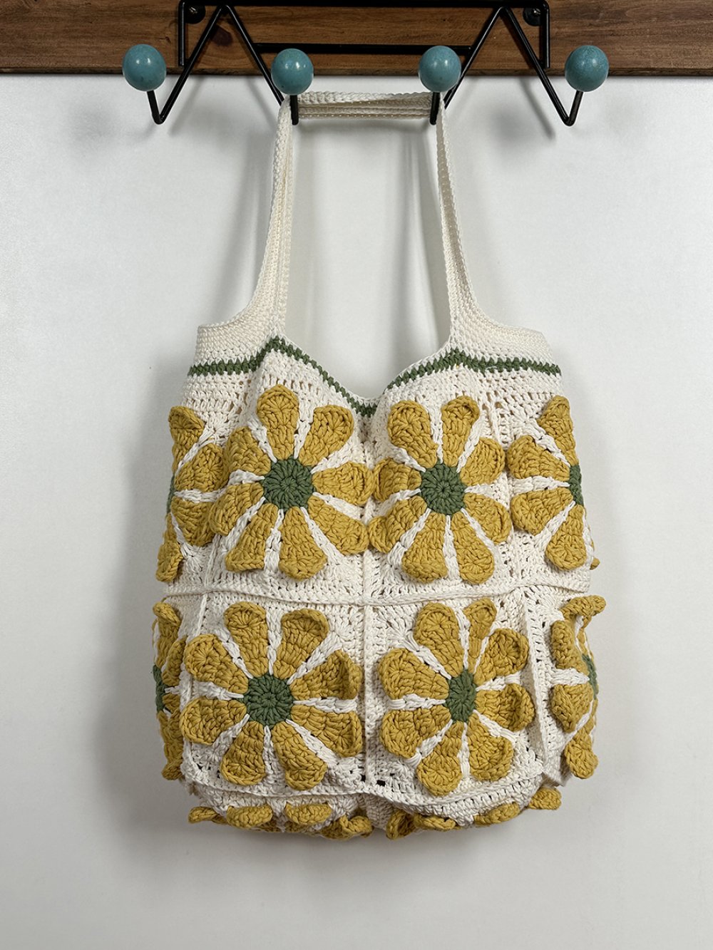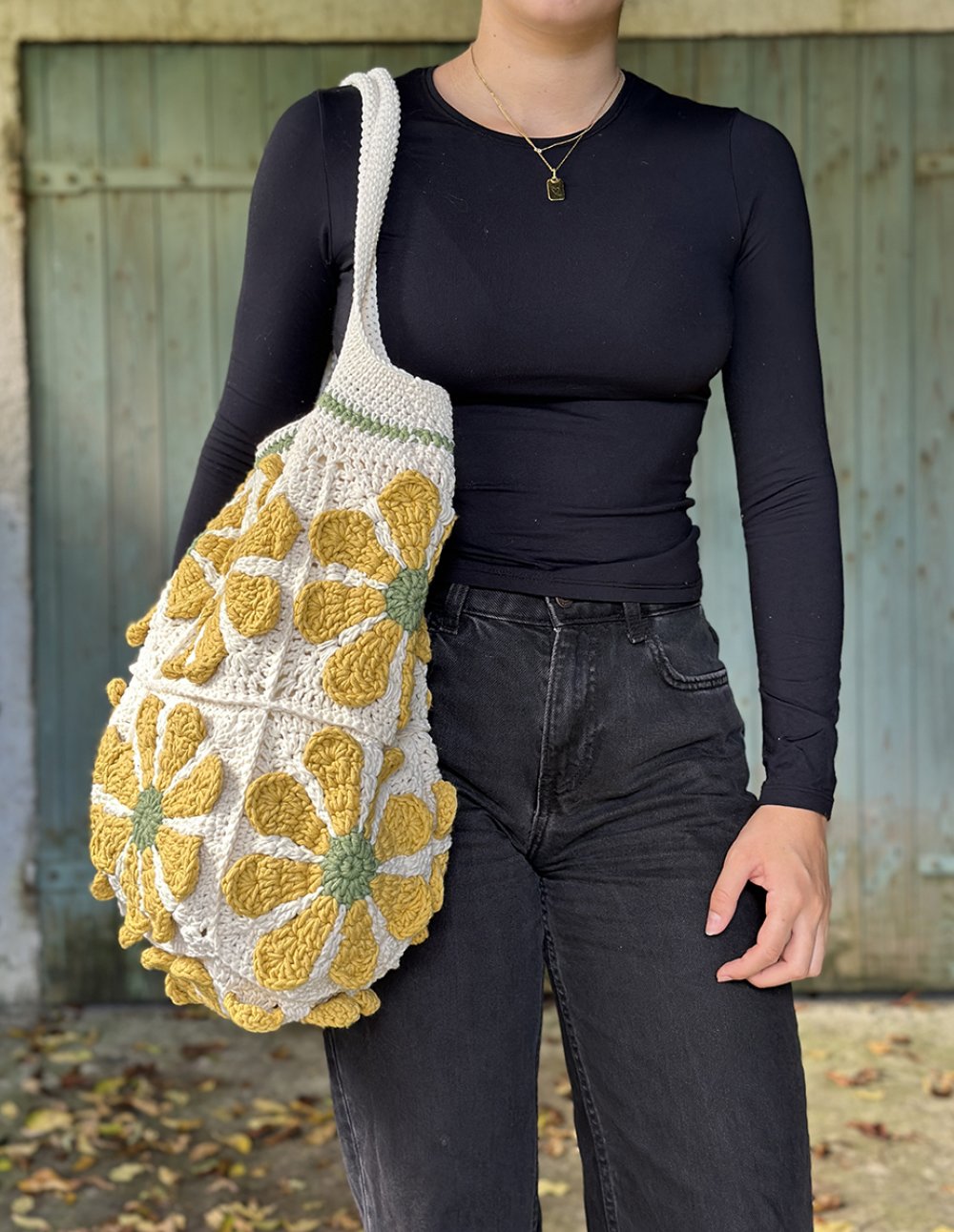 Sac grand format au crochet carré granny fleur dans un style vintage et bohème, écru et jaune, idée cadeau pour femme