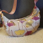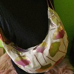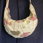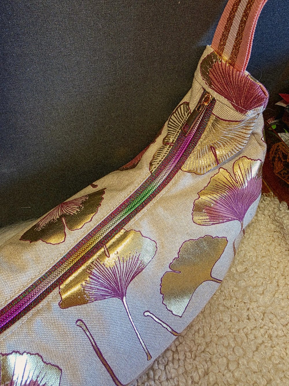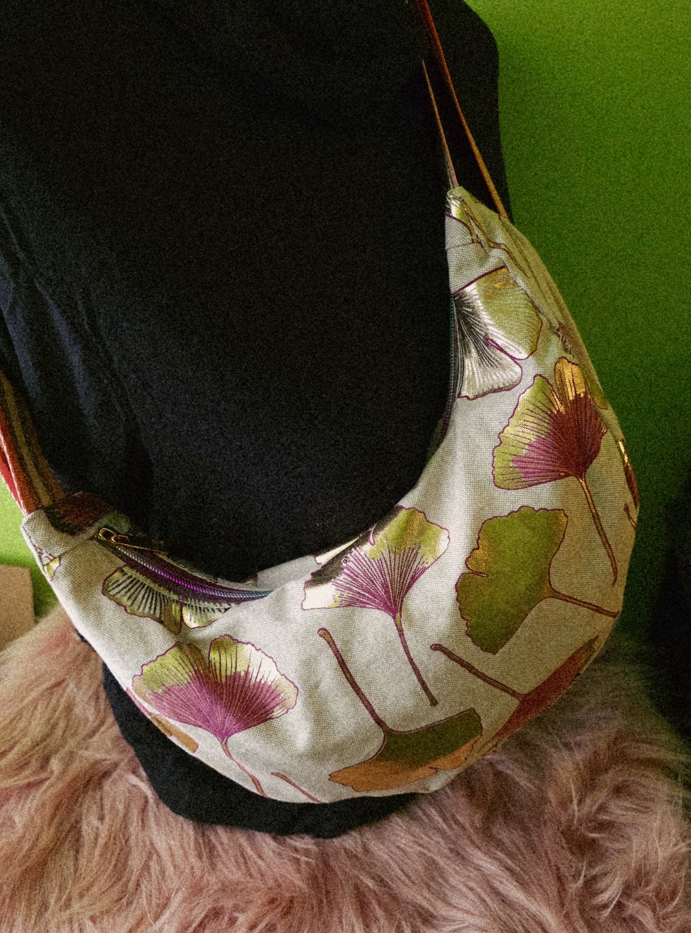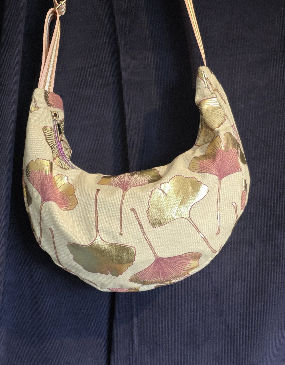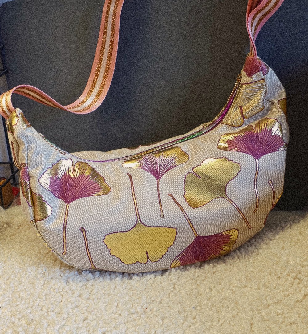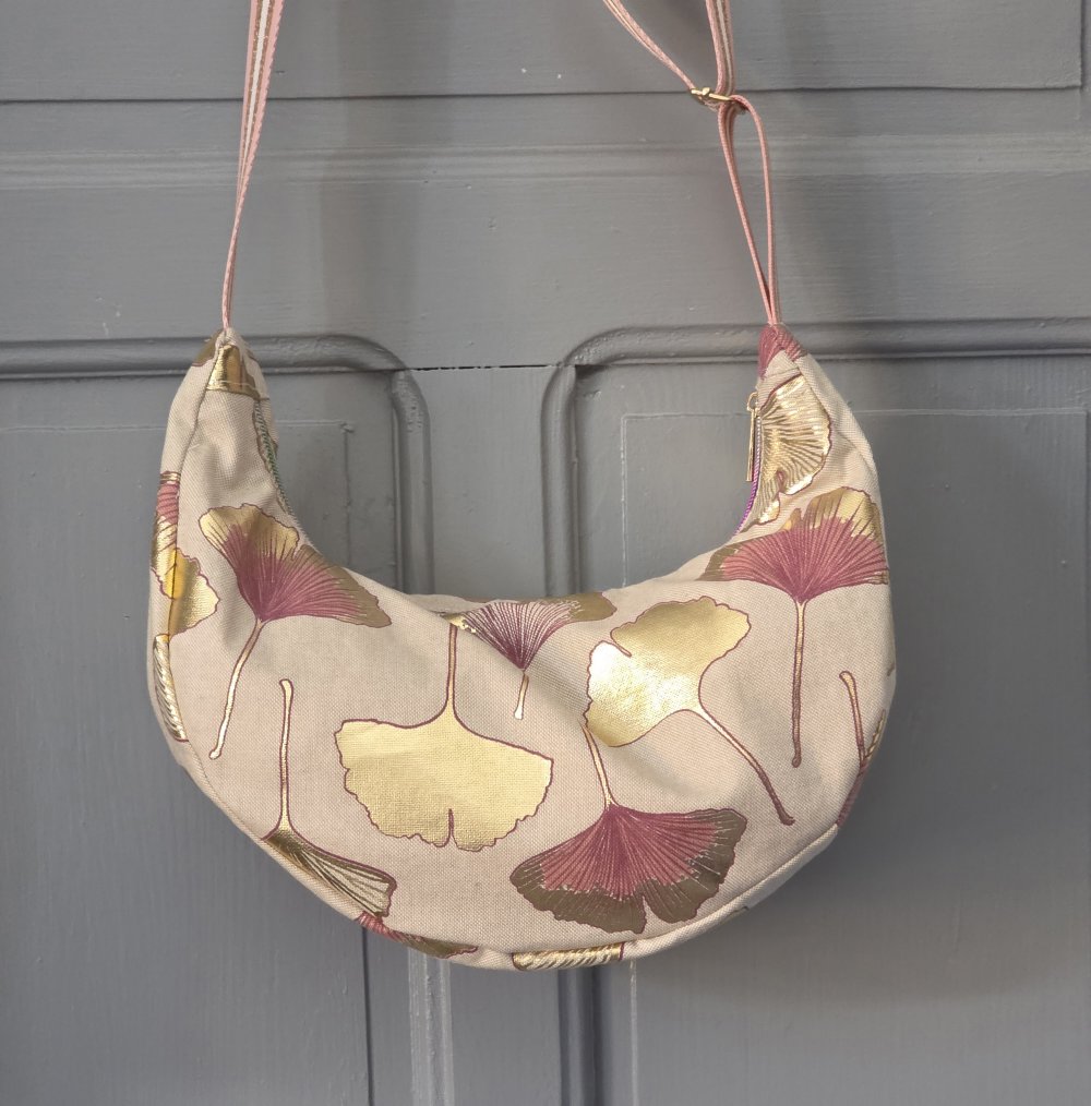 Sac demi lune tissu effet lin motifs feuilles de Ginkgo- sac banane souple bandoulière