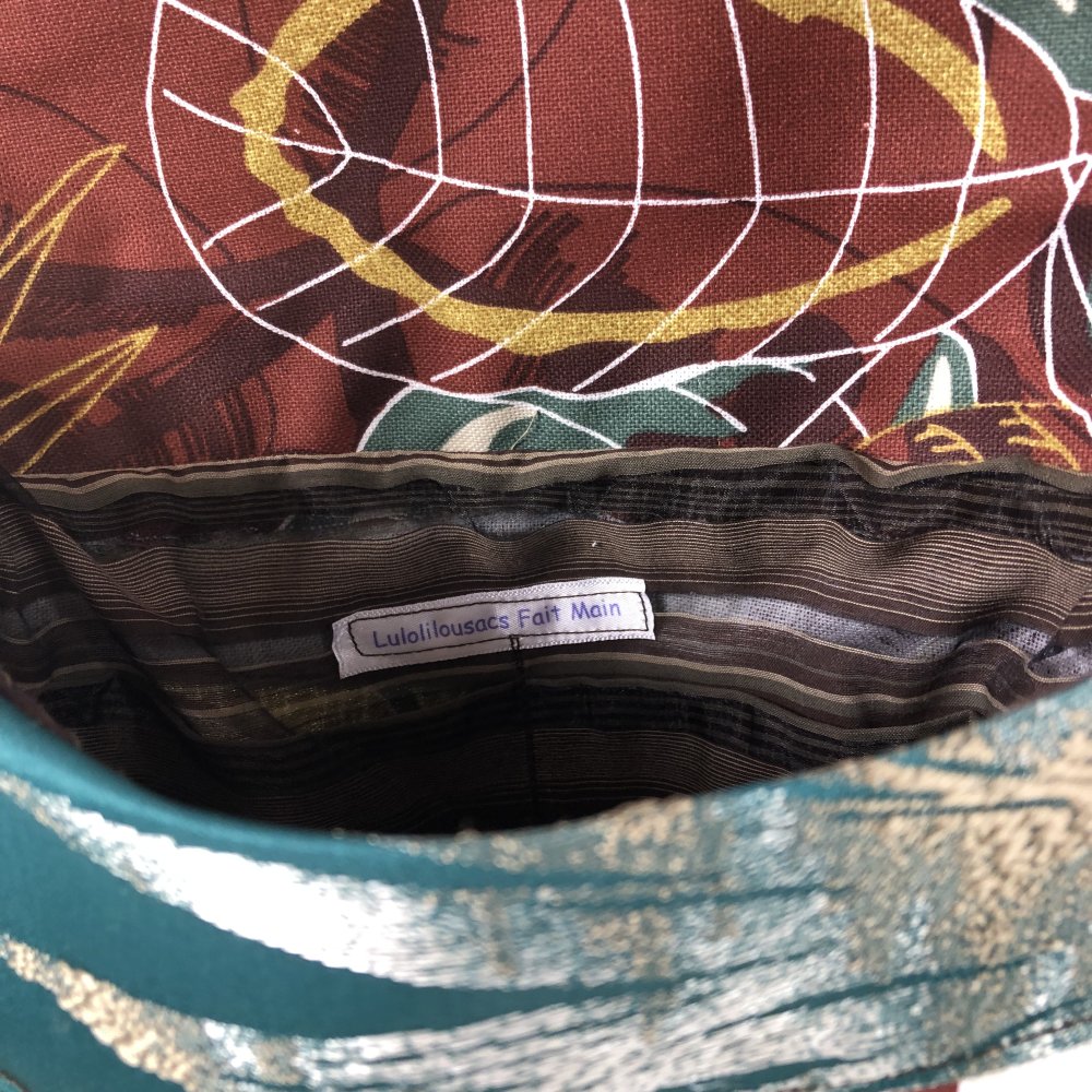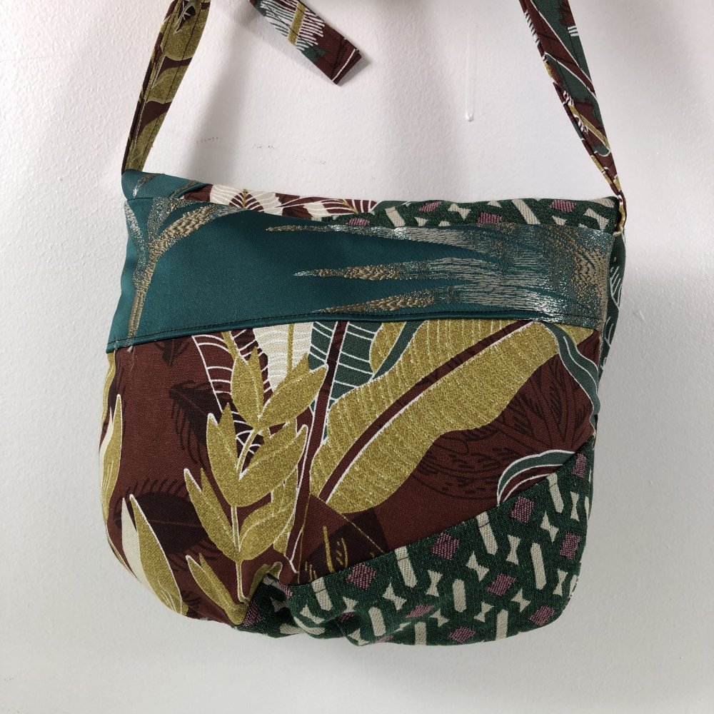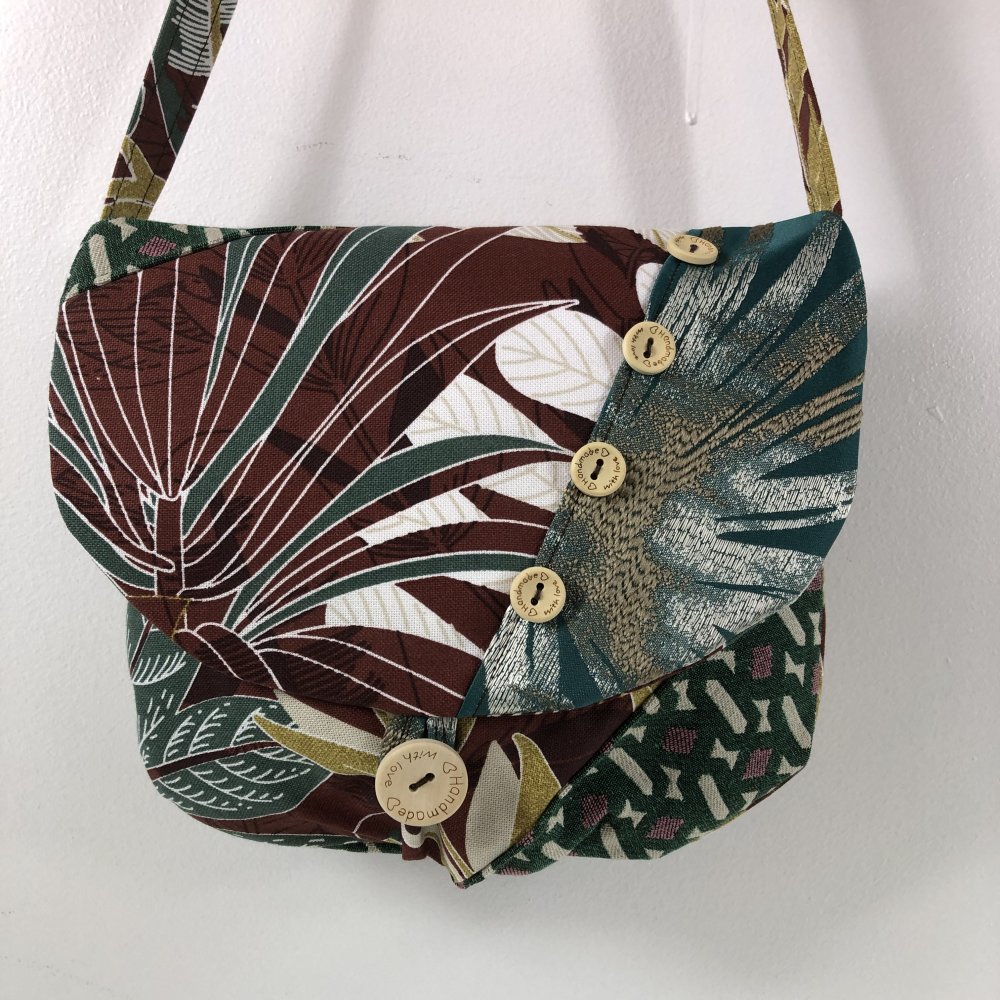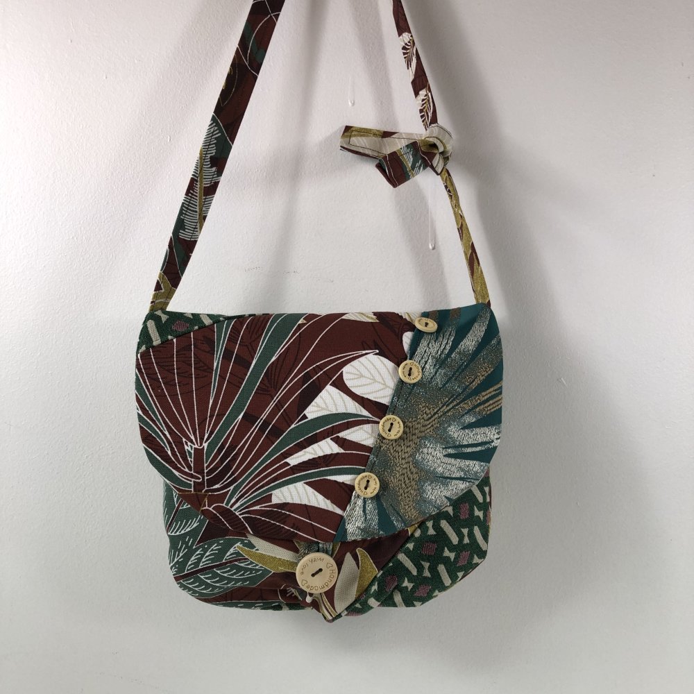 Sac Minaudière Tissus Patchwork Collection Lina Réf 7310 Hauteur 21cm Largeur 24cm Poche Intérieur Anse Bandoulière réglable Fermeture Bouton Doublure Marron Fait Main Modèle Unique