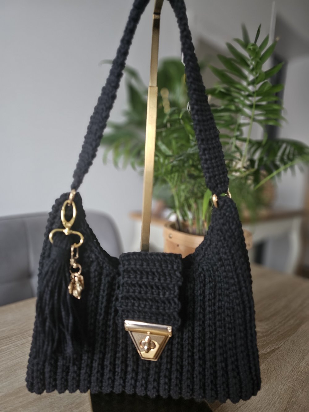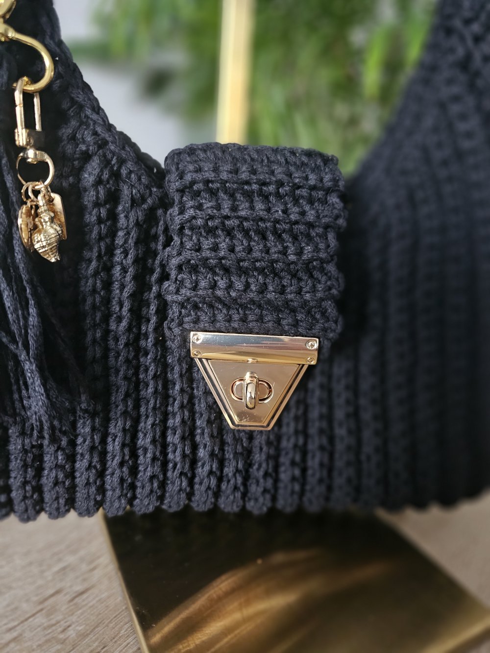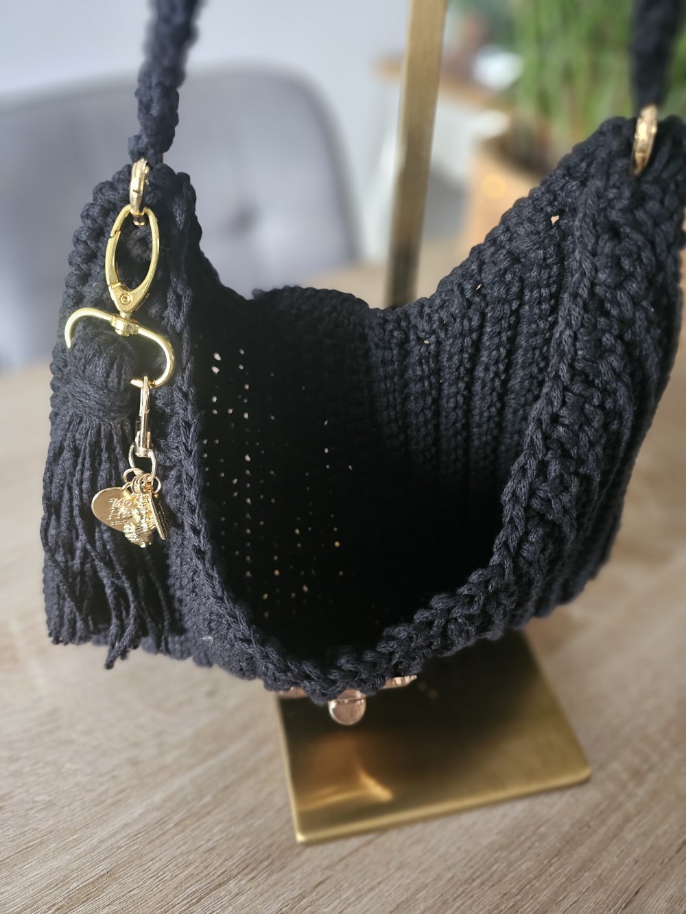 Sac noir en coton à porter à l’épaule – Élégant et pratique, ce sac se porte facilement grâce à sa bandoulière de 40 cm. Il est doté d’une fermeture crochetée et dorée pour une touche raffinée. Dimensions : 24 x 13 cm.