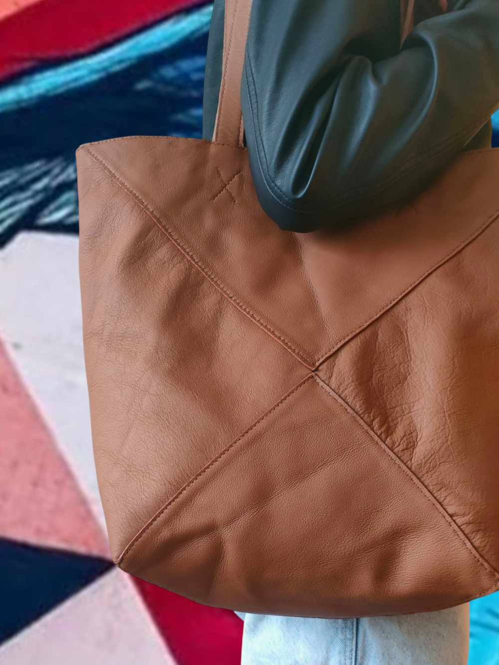 Ce sac cabas d'inspiration Origami est réalisé en cuir de veau souple tannage minéral.