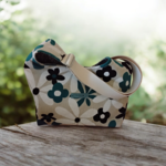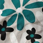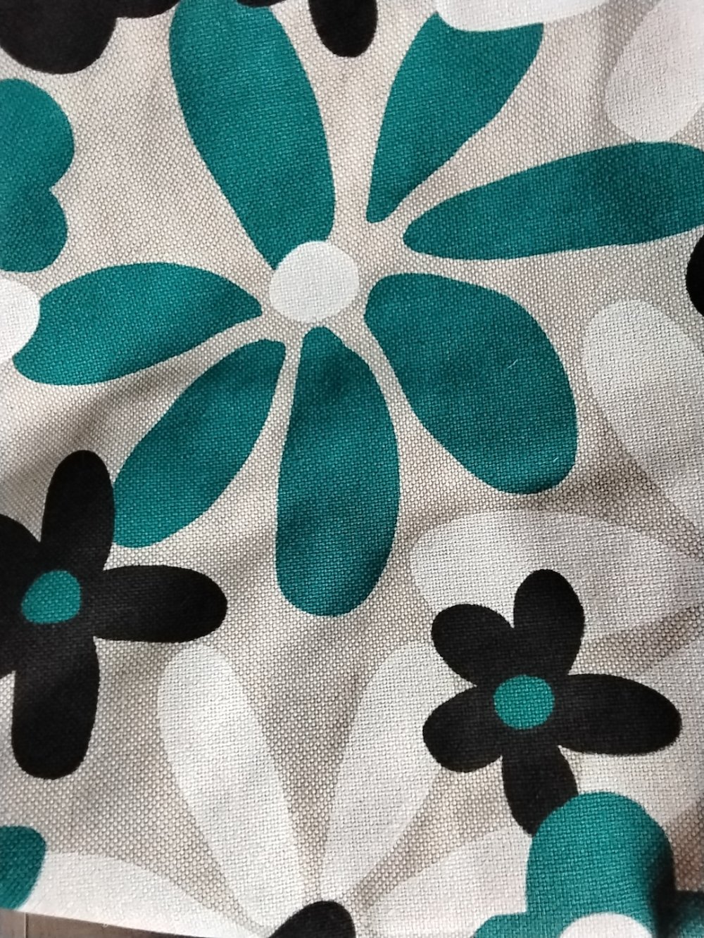 Grande fleur noir, turquoise, écru sur fond beige.