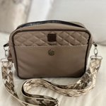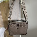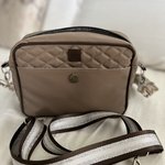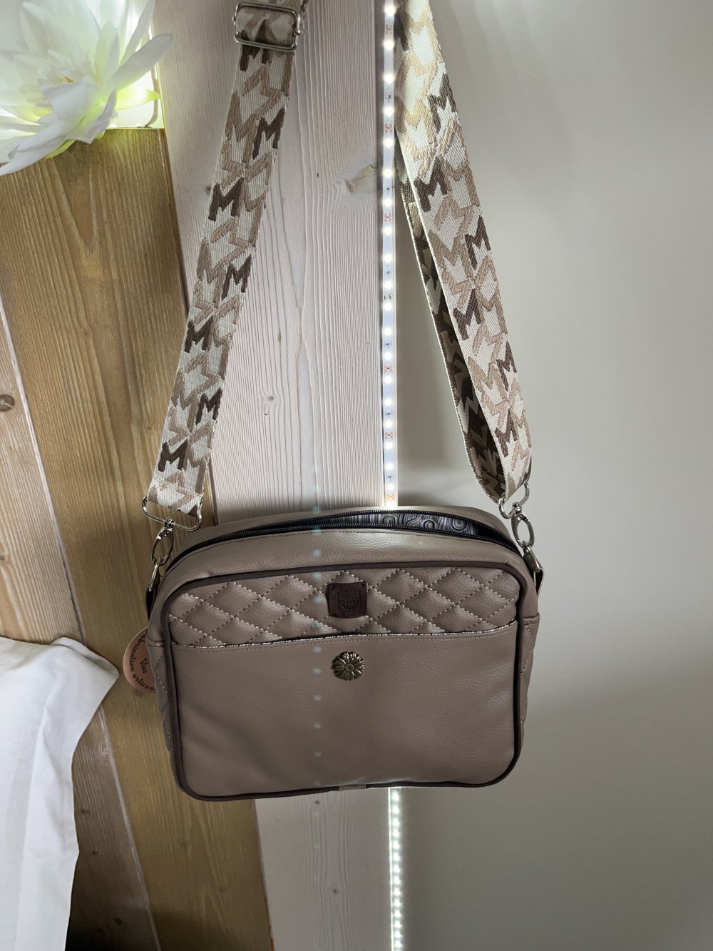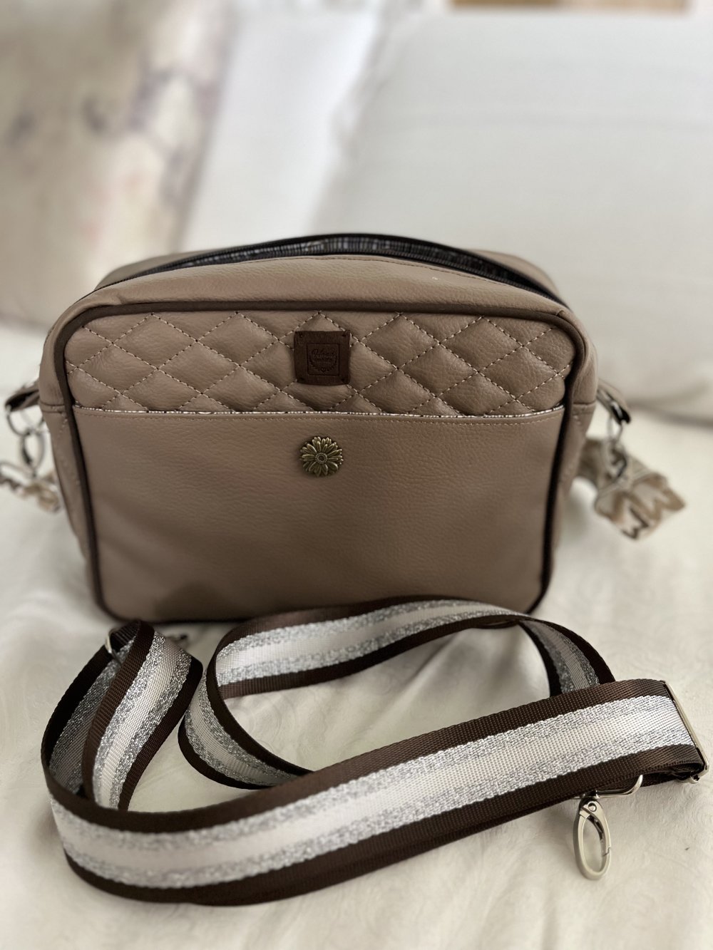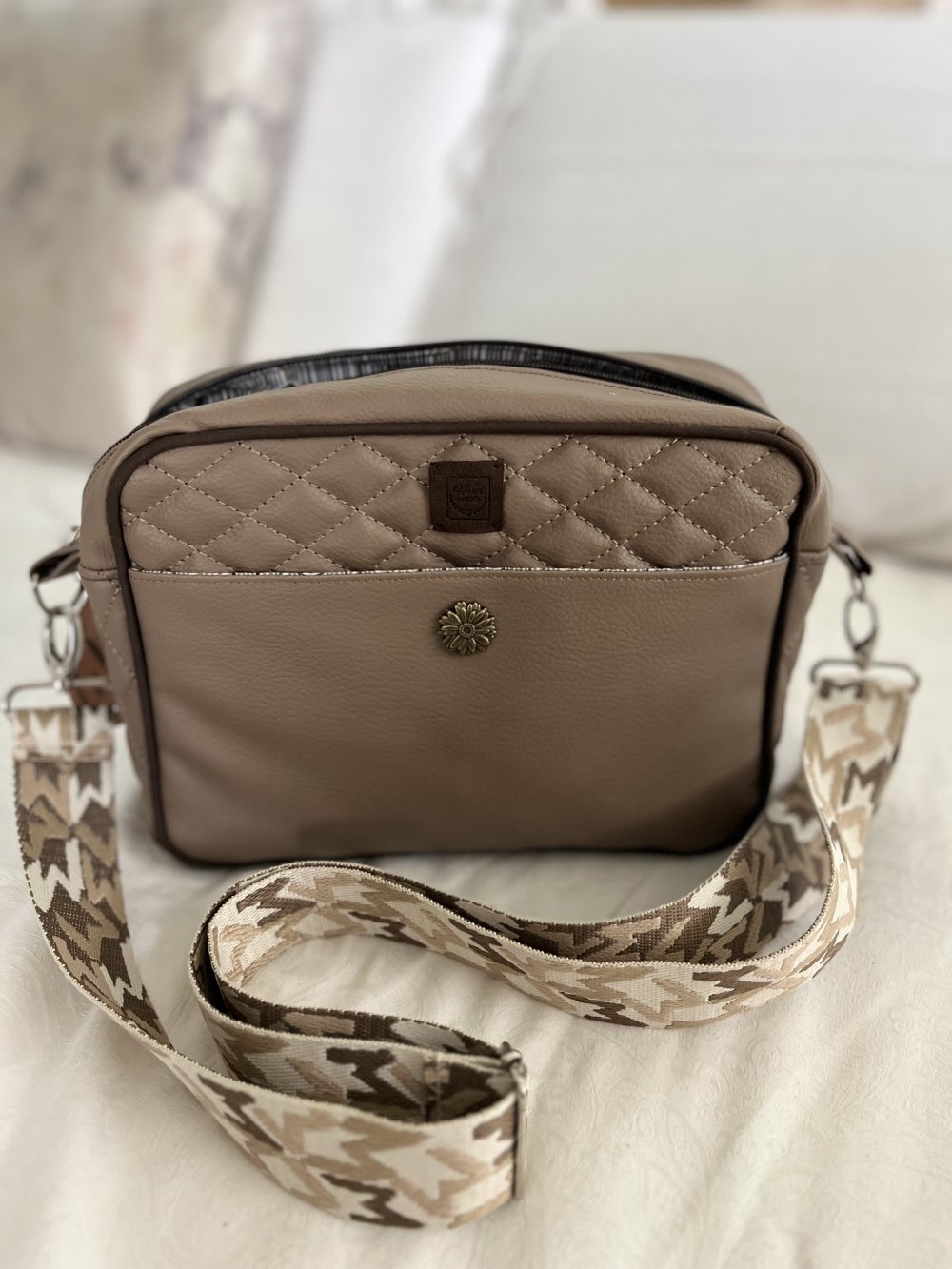 Celle-ci déclinée en camel, 2 tissus simili-cuir dont un style "chanel" très mode et un simili granulé mat.