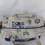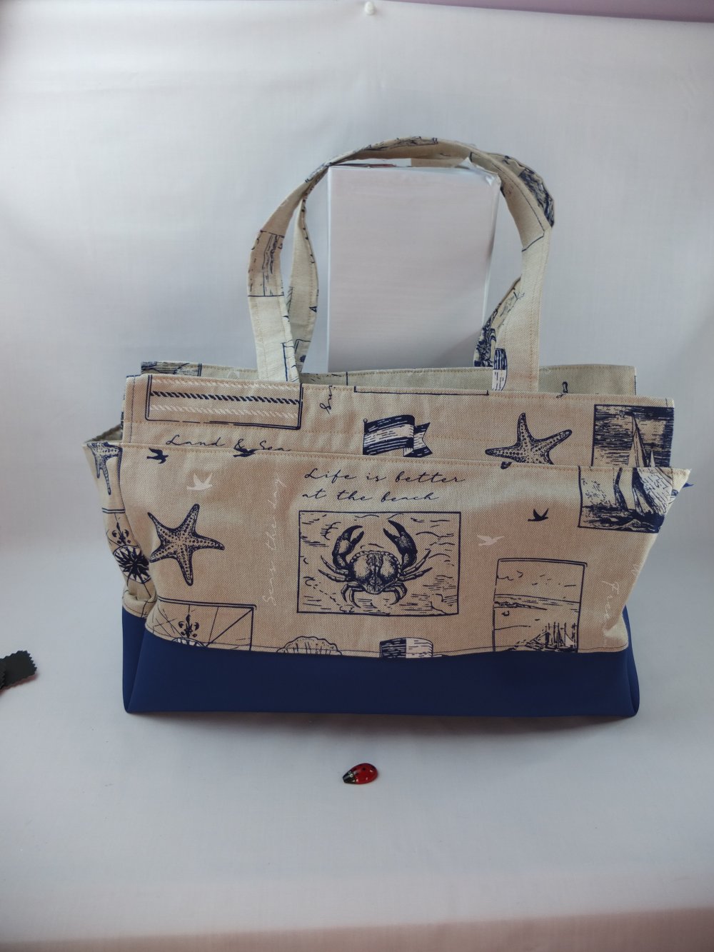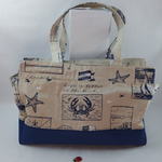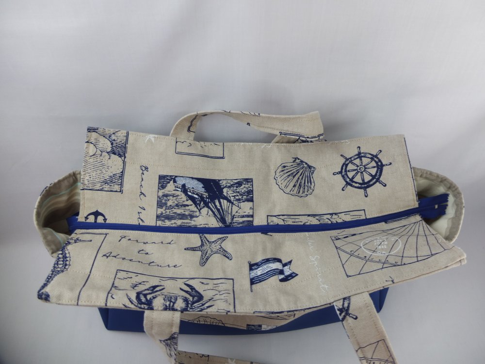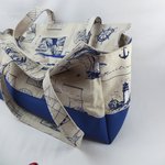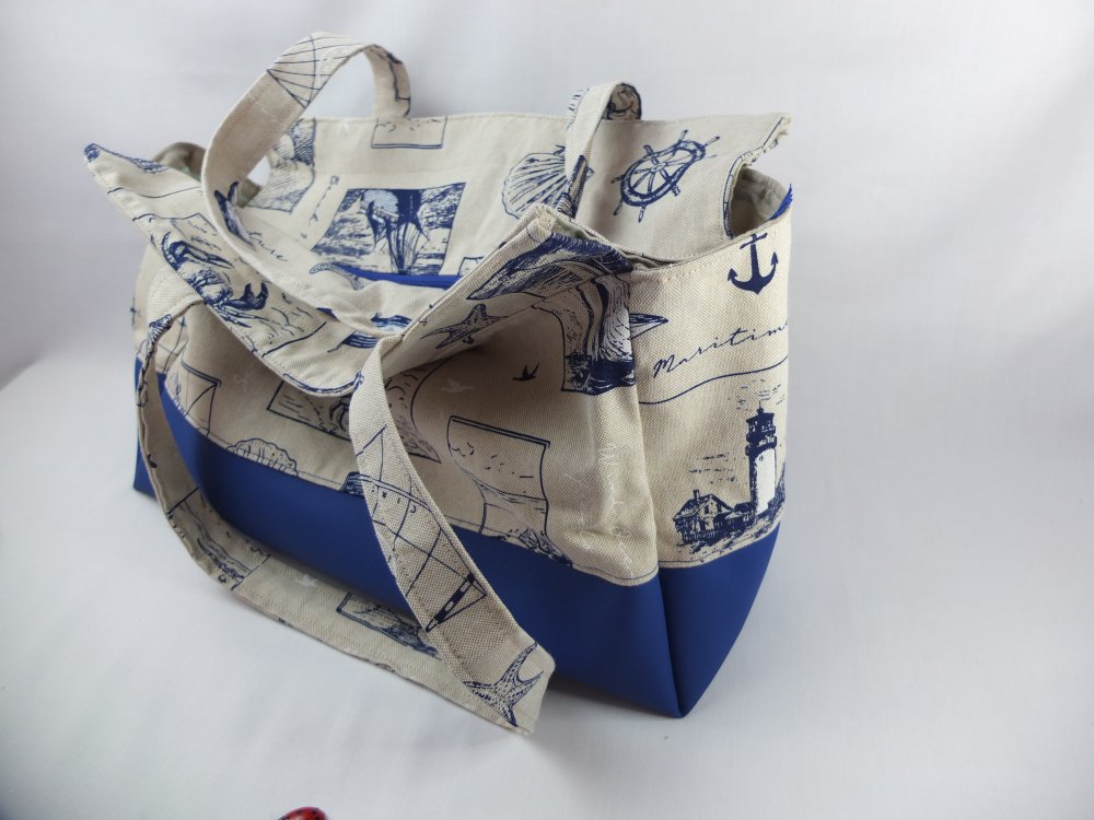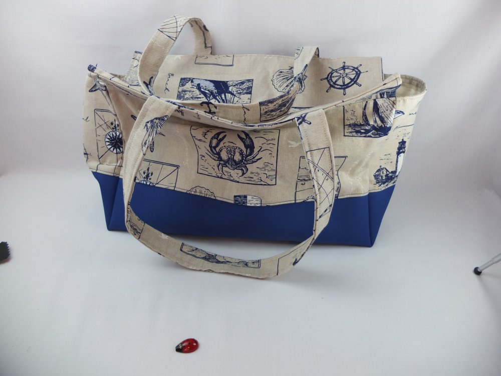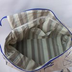 Cabas sac de plage fabriqué en tissu lavable. Rayures de couleurs bleues, gris et blanc. Le bas en tissu simili bleu clair, pour protéger le bas du sac de l'eau.