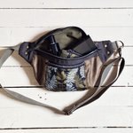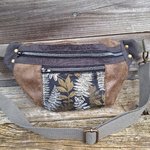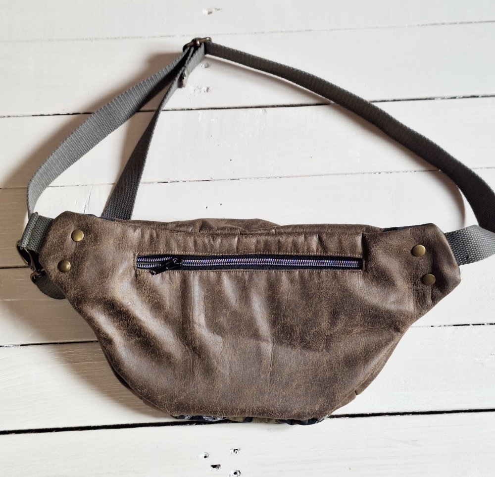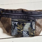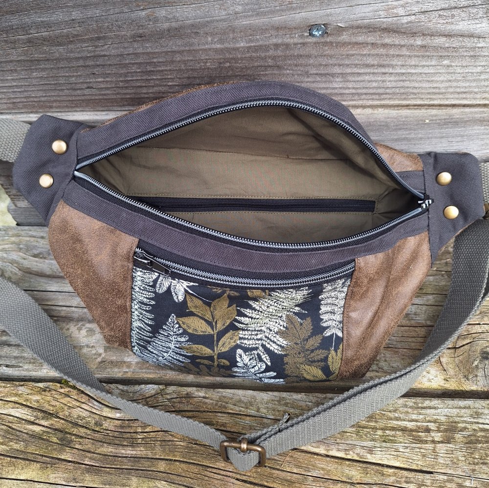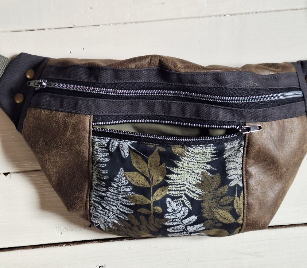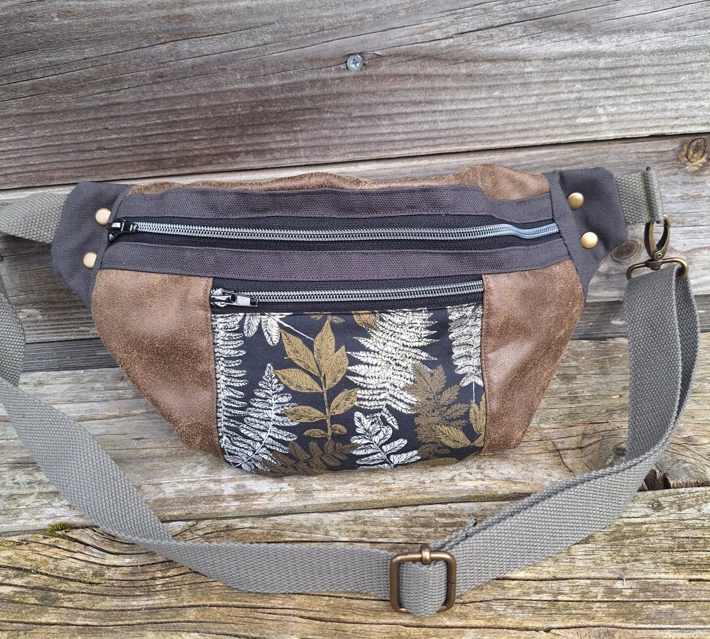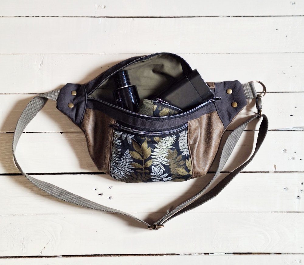 grand sac banane pour homme ou mixte en faux cuir kaki ocre, tissu noir avec un imprimé fougères et forêt, toile de coton grise, idée cadeau unique et artisanale
