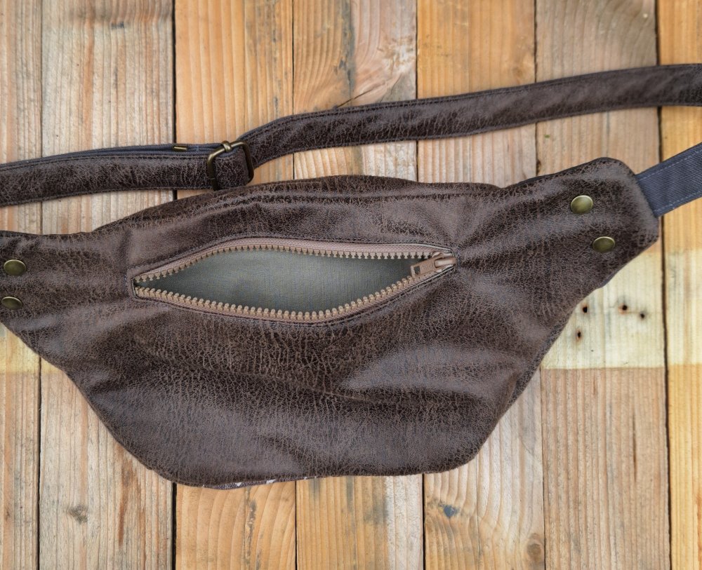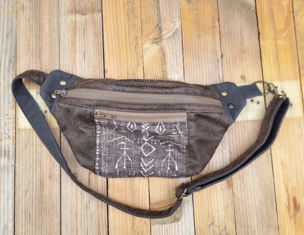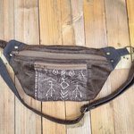 grand sac banane pour homme ou mixte en faux cuir taupe, tissu gris ethnique, toile de coton grise, ceinture réglable , sacoche de ceinture