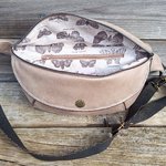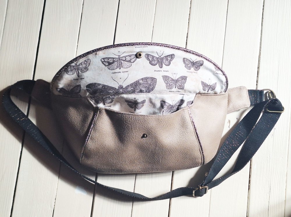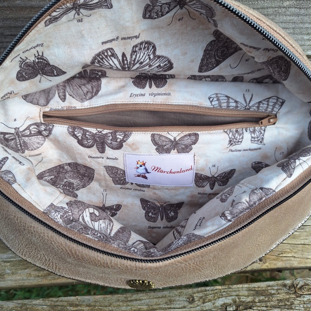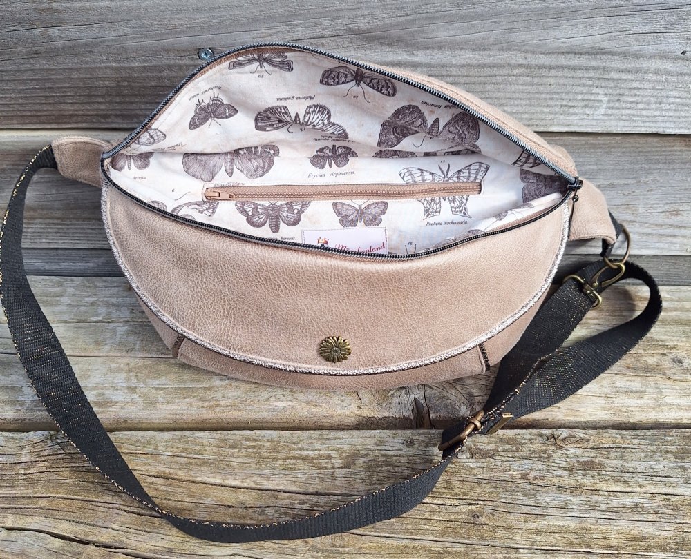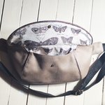 Grand sac banane XL pour femme avec rabat en faux cuir taupe et tissu beige avec des papillons ,sac à bandoulière, style bohème et vintage, passepoil bronze, idéal pour Voyager ou le Quotidien