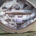 La doublure est en tissu de coton beige avec des papillons dans un style vintage et en coton taupe uni.