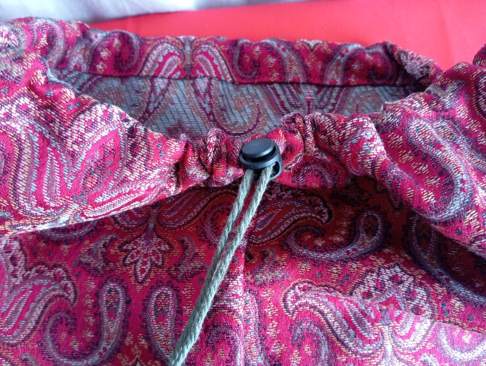 Lien de coton vert passant dans ourlet en haut avec un bloqueur en pvc pour ajuster la fermeture , ce lien est cousu solidement à la base du sac .