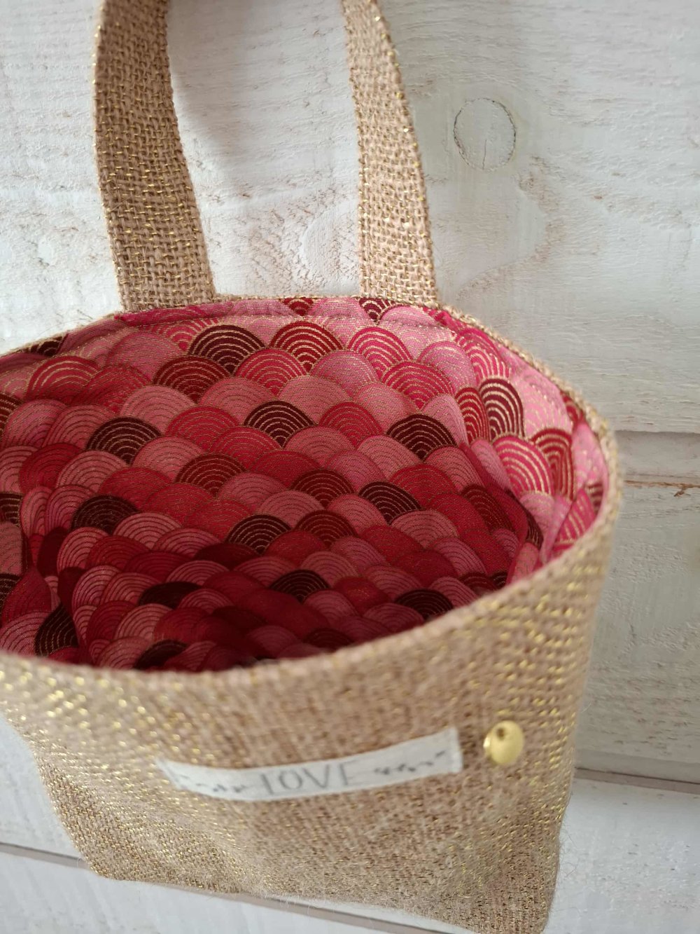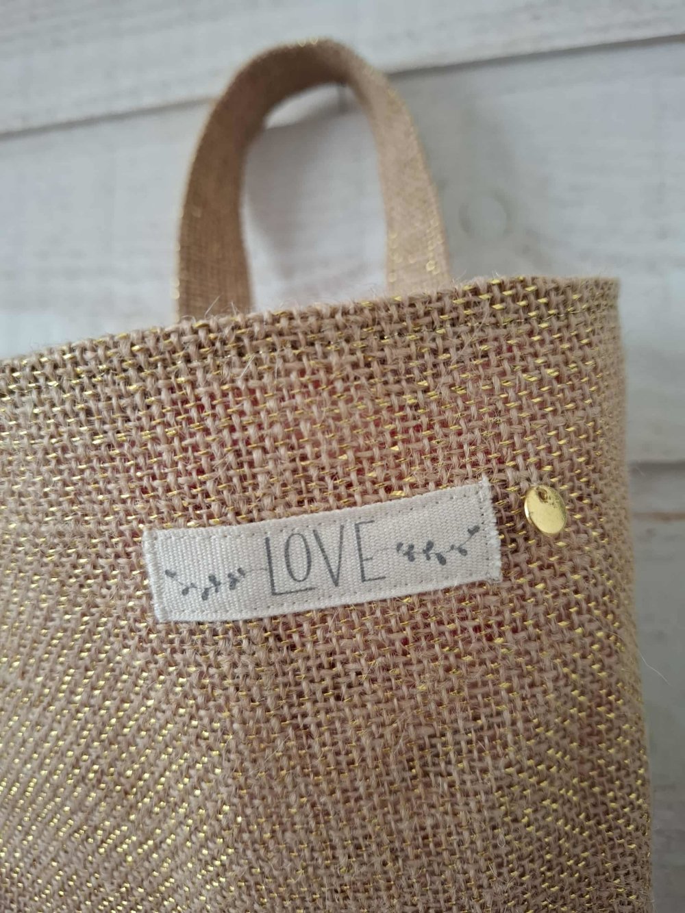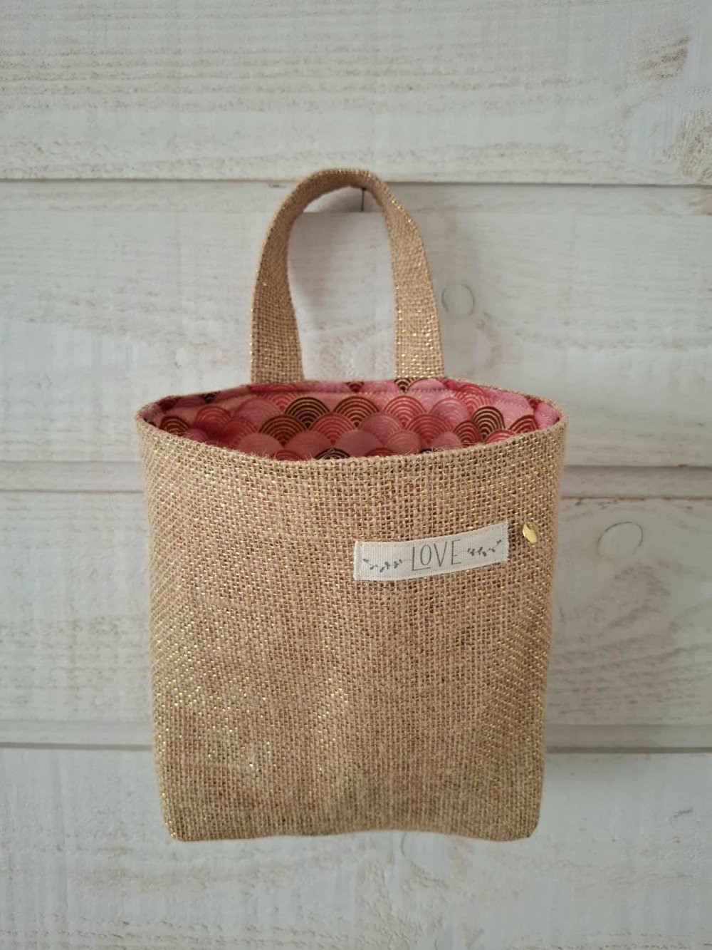 - Tissu de jute doré et coton rose japonisant - Ruban "Love"