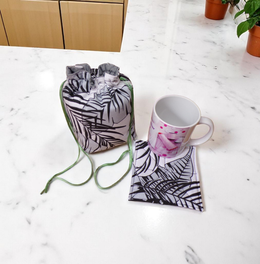 Pochette pour mug, sac de rangement forme pochon et son sous mug.