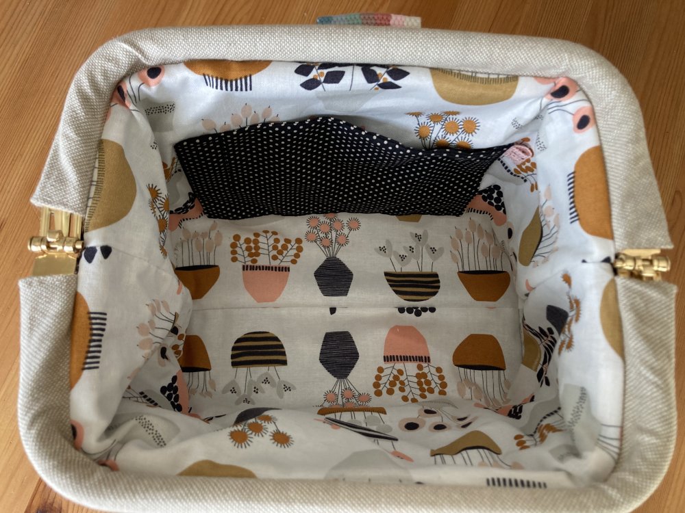L’intérieur est agrémenté d’une poche plaquée avec un petit insert pour glisser des aiguilles à tricoter par exemple, ou un crayon / crochet.