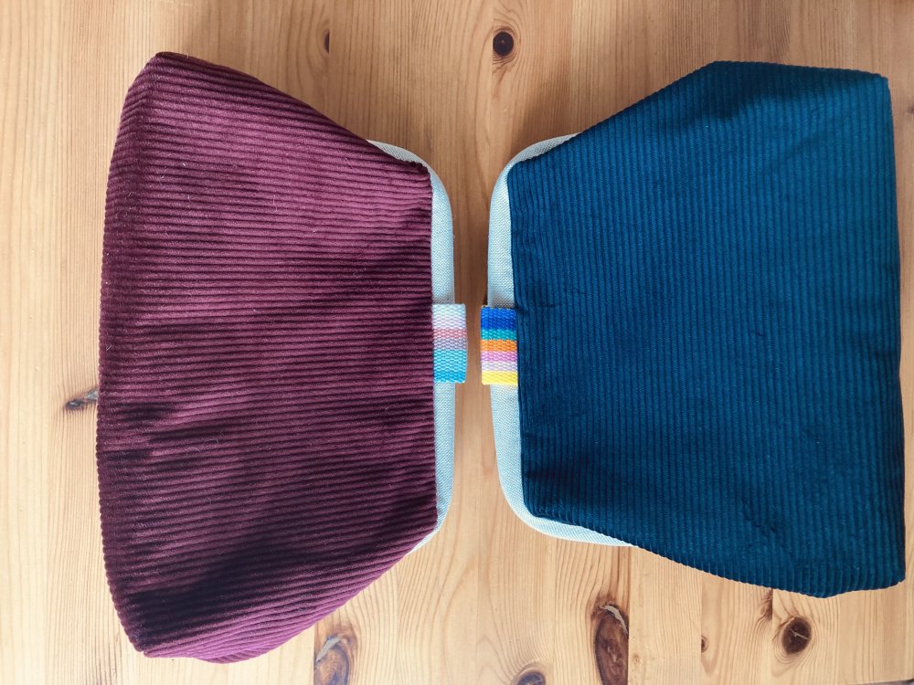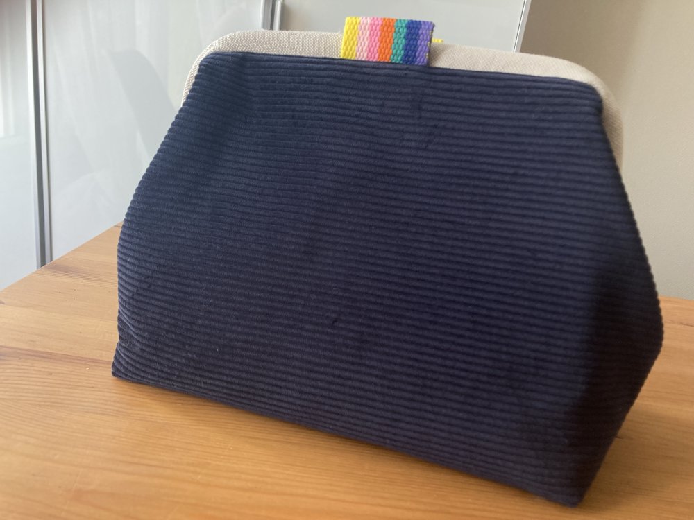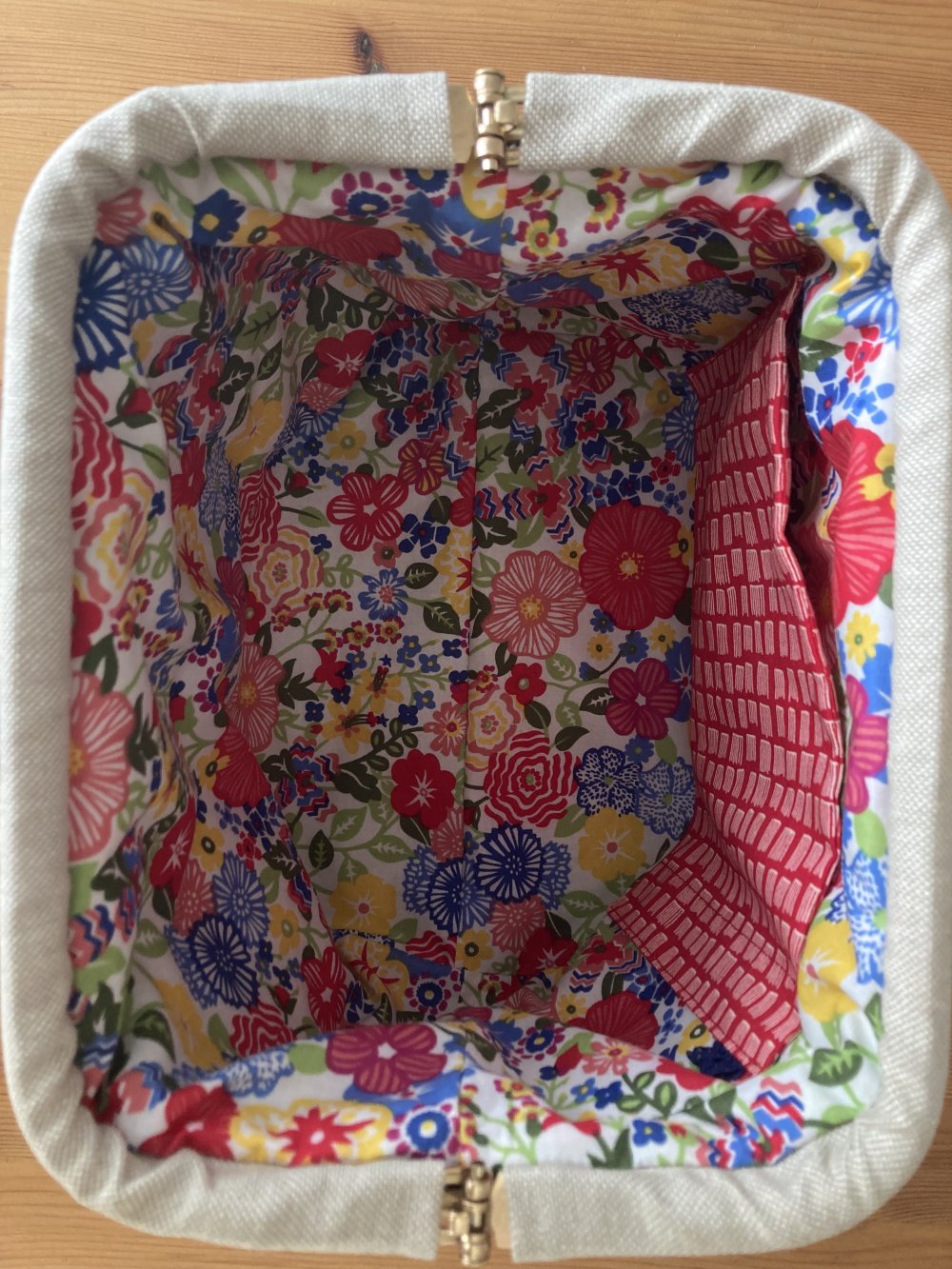 Le sac comporte un fermoir cadre rigide à ressort qui permet de l’ouvrir ou de le fermer rapidement. Sangles multicolores ajoutées dans la couture pour faciliter l’ouverture. L’intérieur est agrémenté d’une poche plaquée avec un petit insert pour glisser des aiguilles à tricoter par exemple, ou un crayon / crochet.