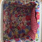 Cousu main dans un tissu velours bleu marine (renforcé par une ouate thermocollante pour plus de tenue) et doublure en coton liberty à imprimé floral.