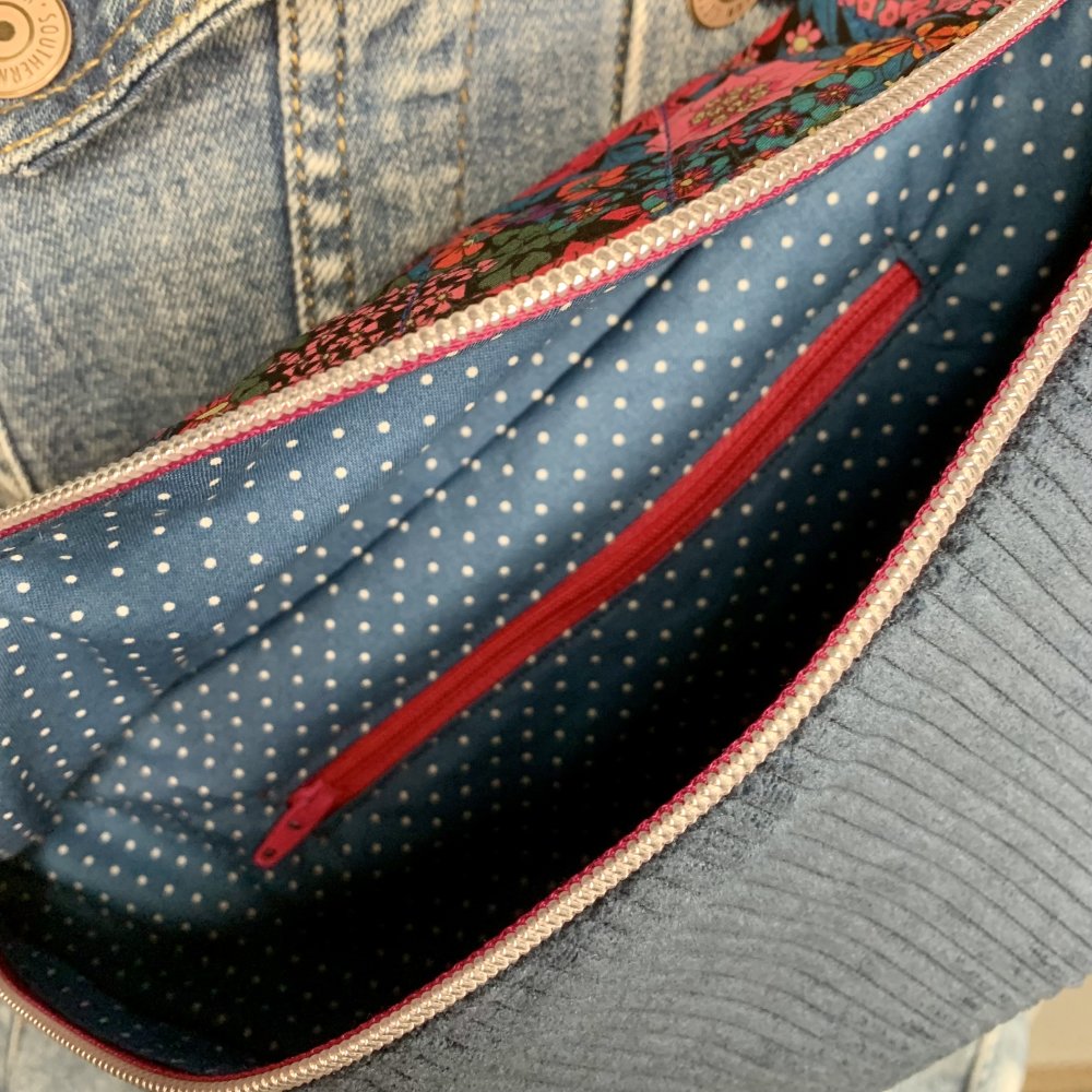 L'intérieur est en coton bleu à pois blancs et la petite poche avec fermeture éclair est également très utile pour garder des objets en sécurité.