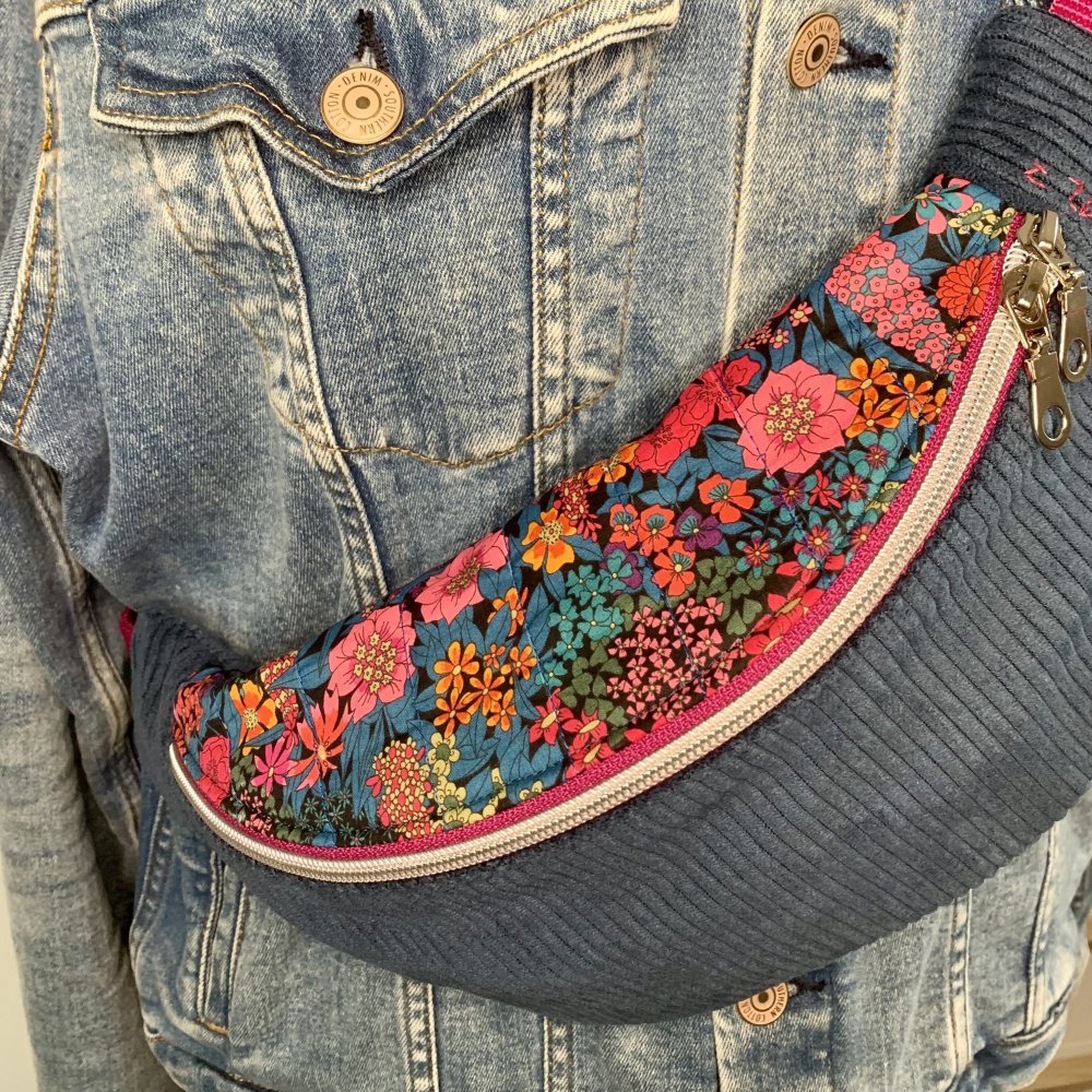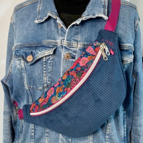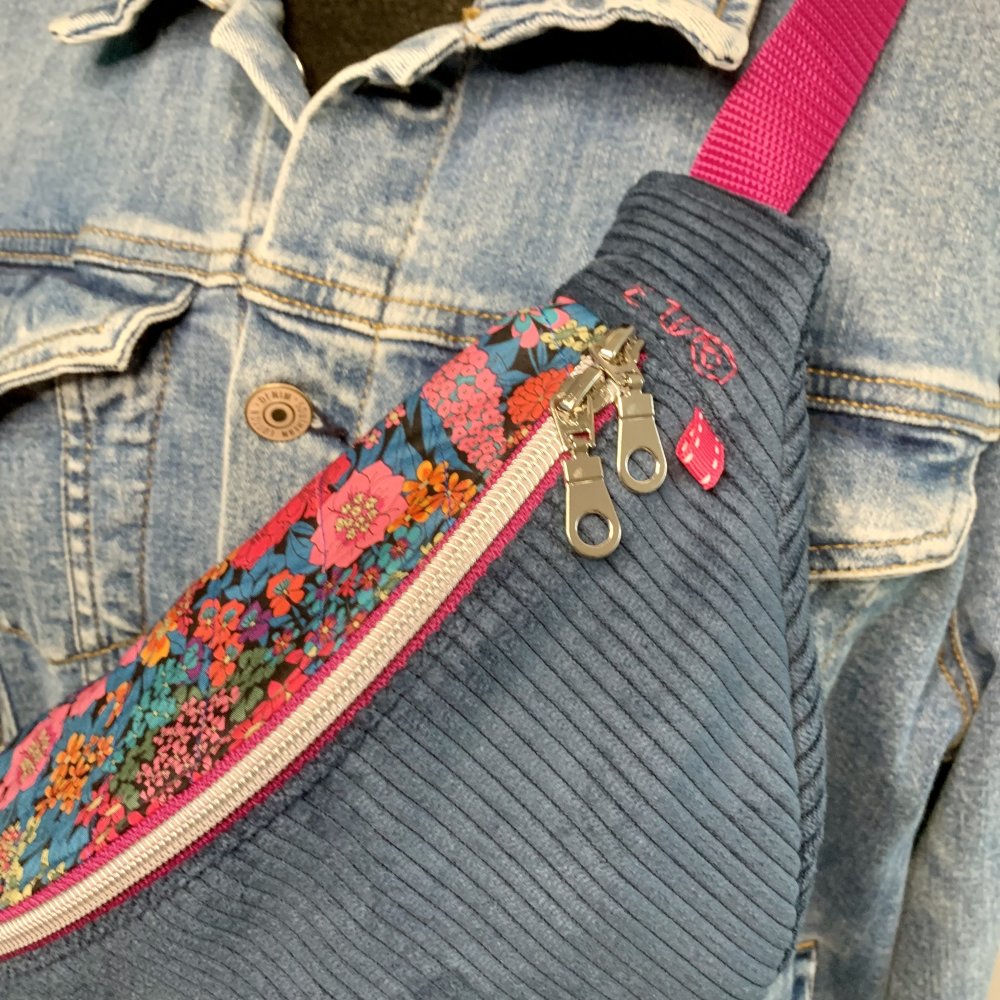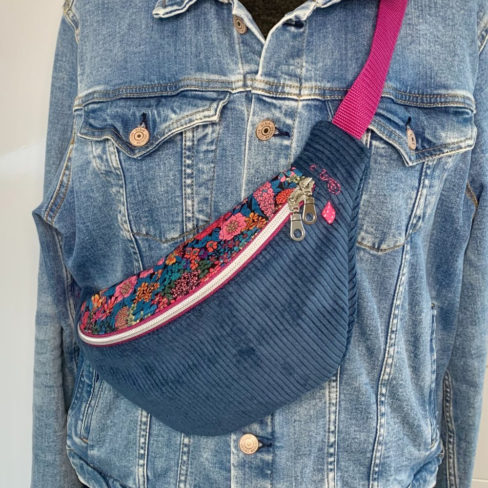 Ce modèle est en velours bleu avec un dessus en coton Liberty très coloré.