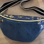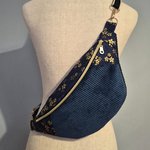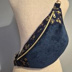 Sac banane en velours côtelé bleu nuit et motif fleuri doré