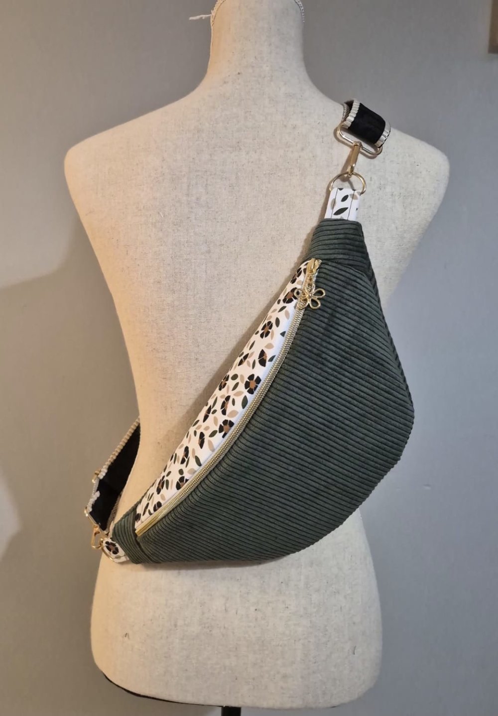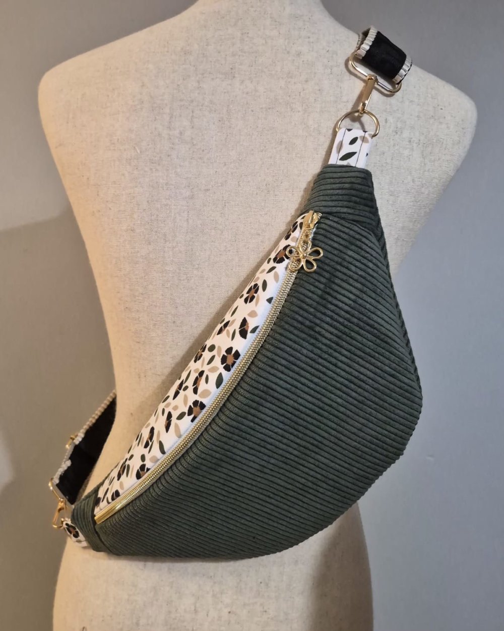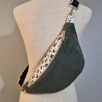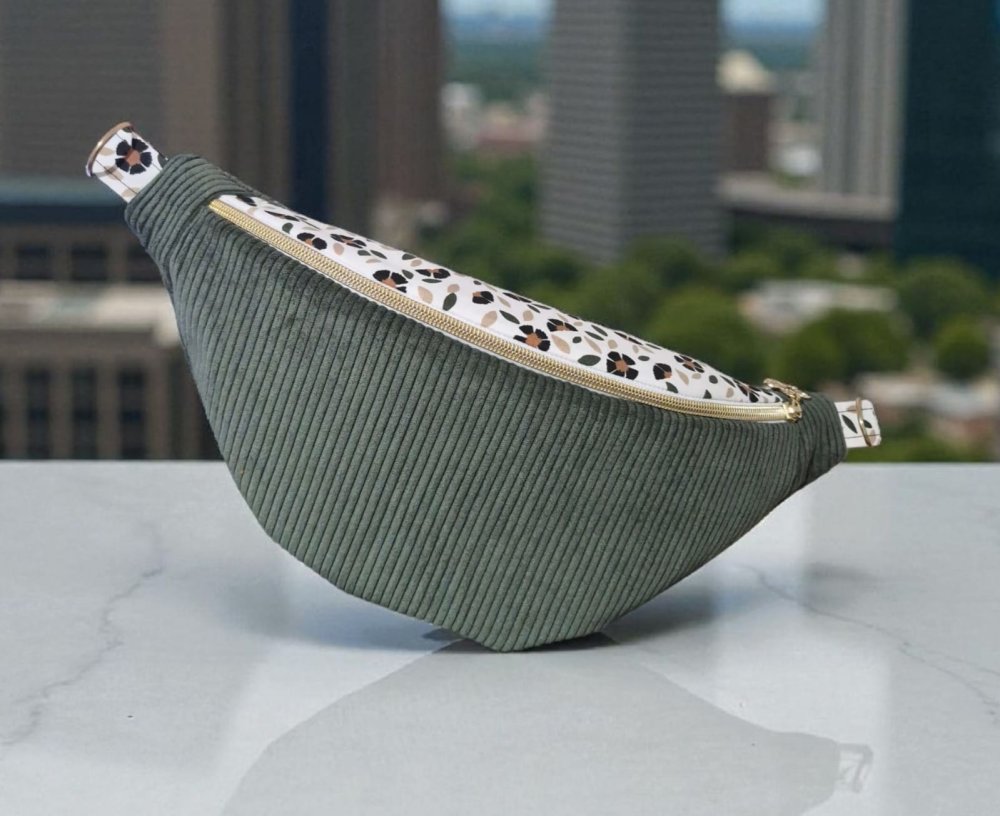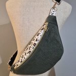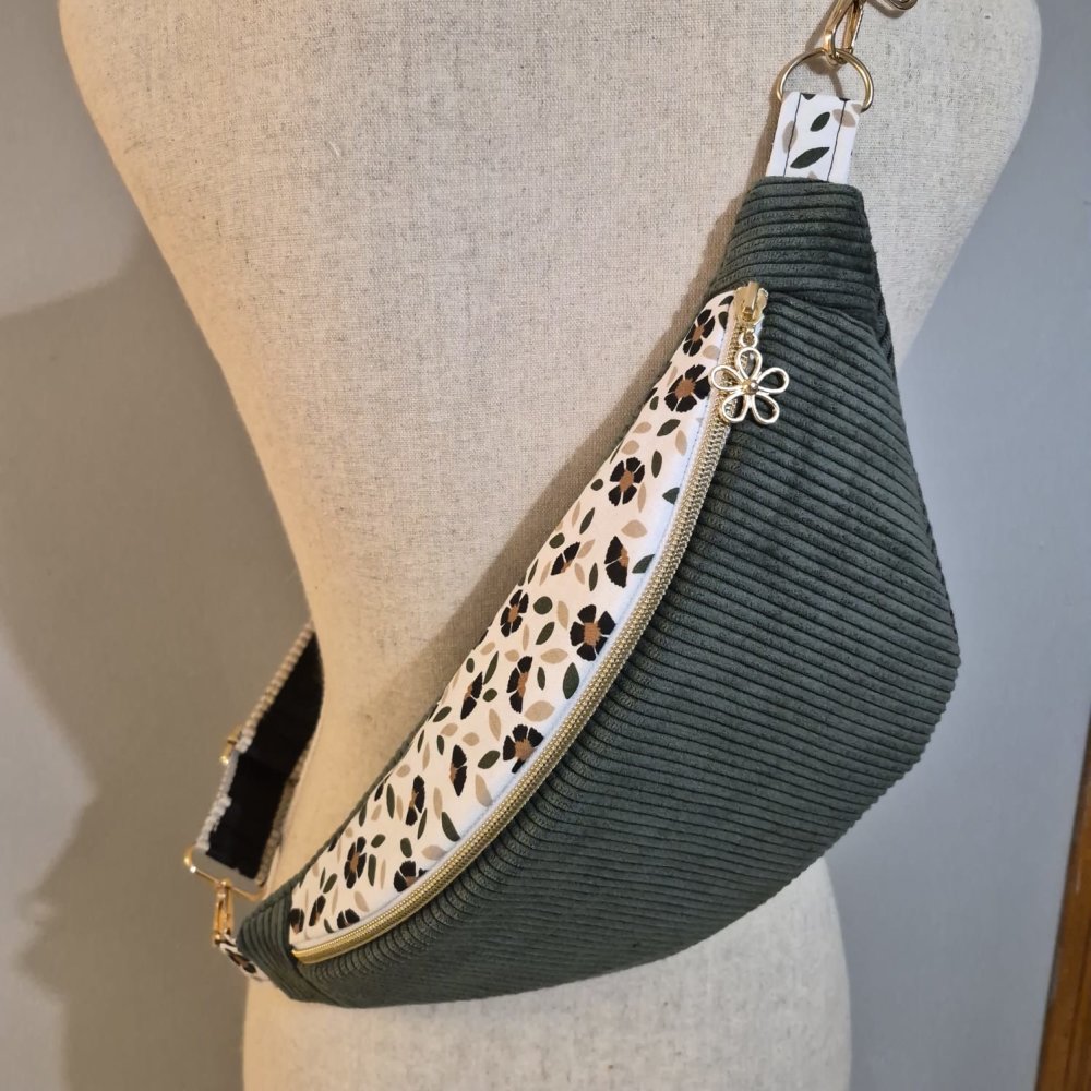 Sac banane femme en velours côtelé kaki – motif fleuri , plusieurs tailles disponibles