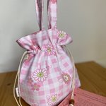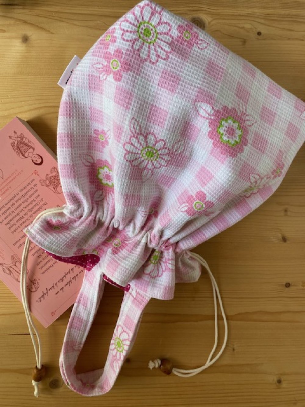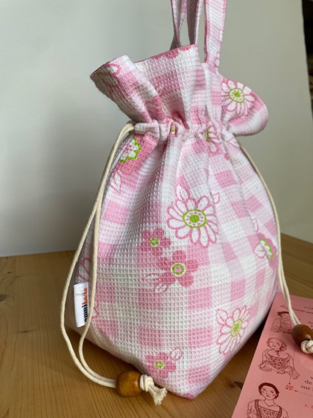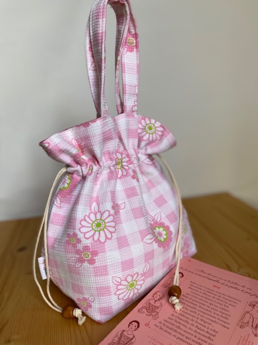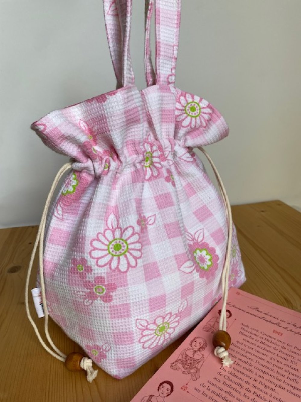 Il possède deux anses et ferme grâce à un cordon de serrage avec finition perles de bois. Il est entièrement doublé d'une gabardine de coton assortie.