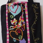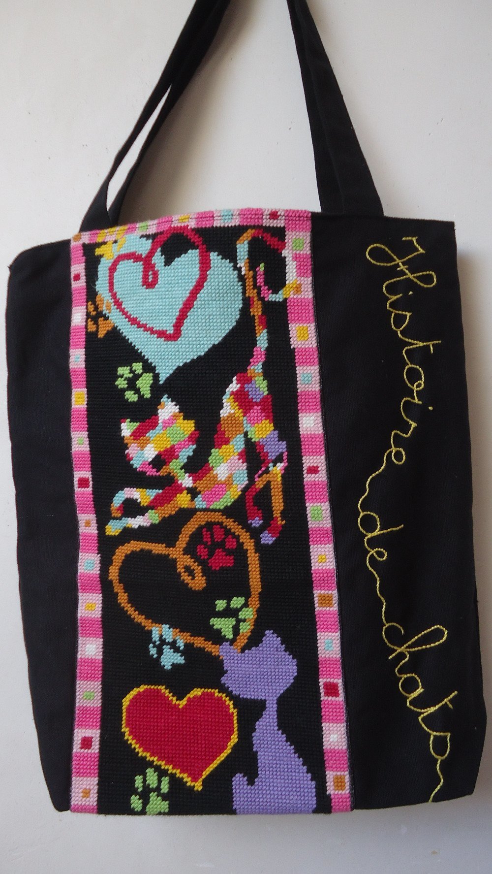 Sac cabas décoré d'un canevas chats mosaïques et coeurs customisé,broderie au point de tige,modèle unique, création laboutikasoizic.
