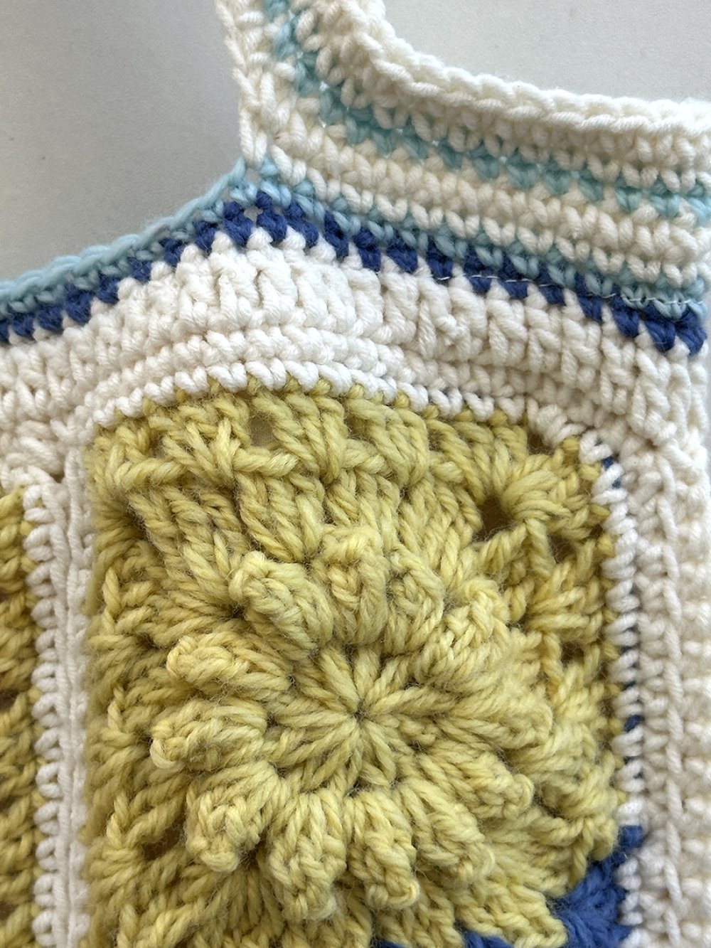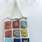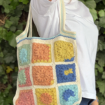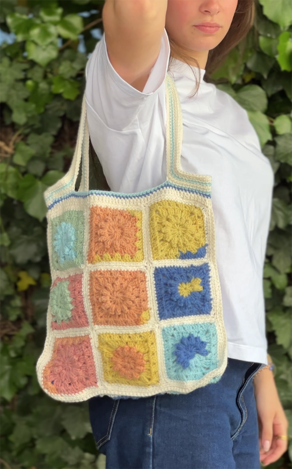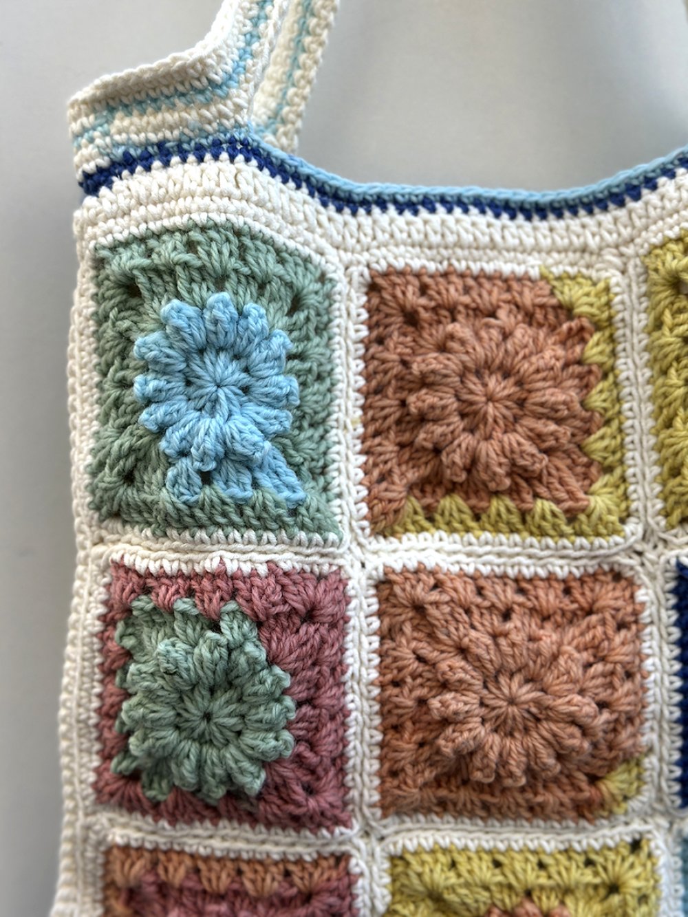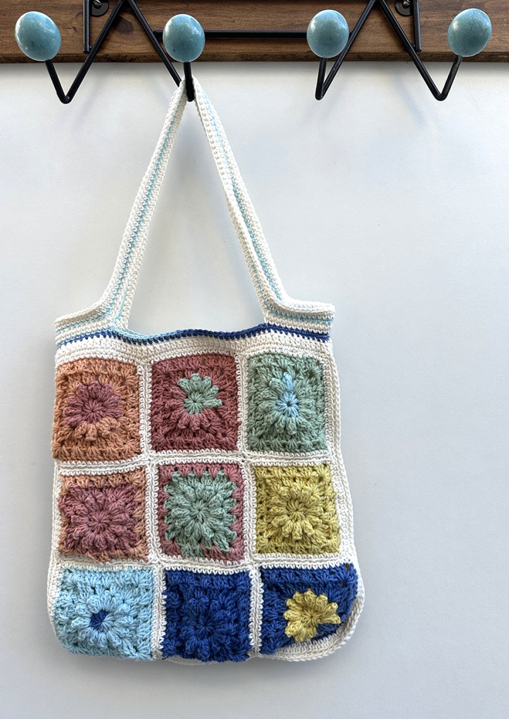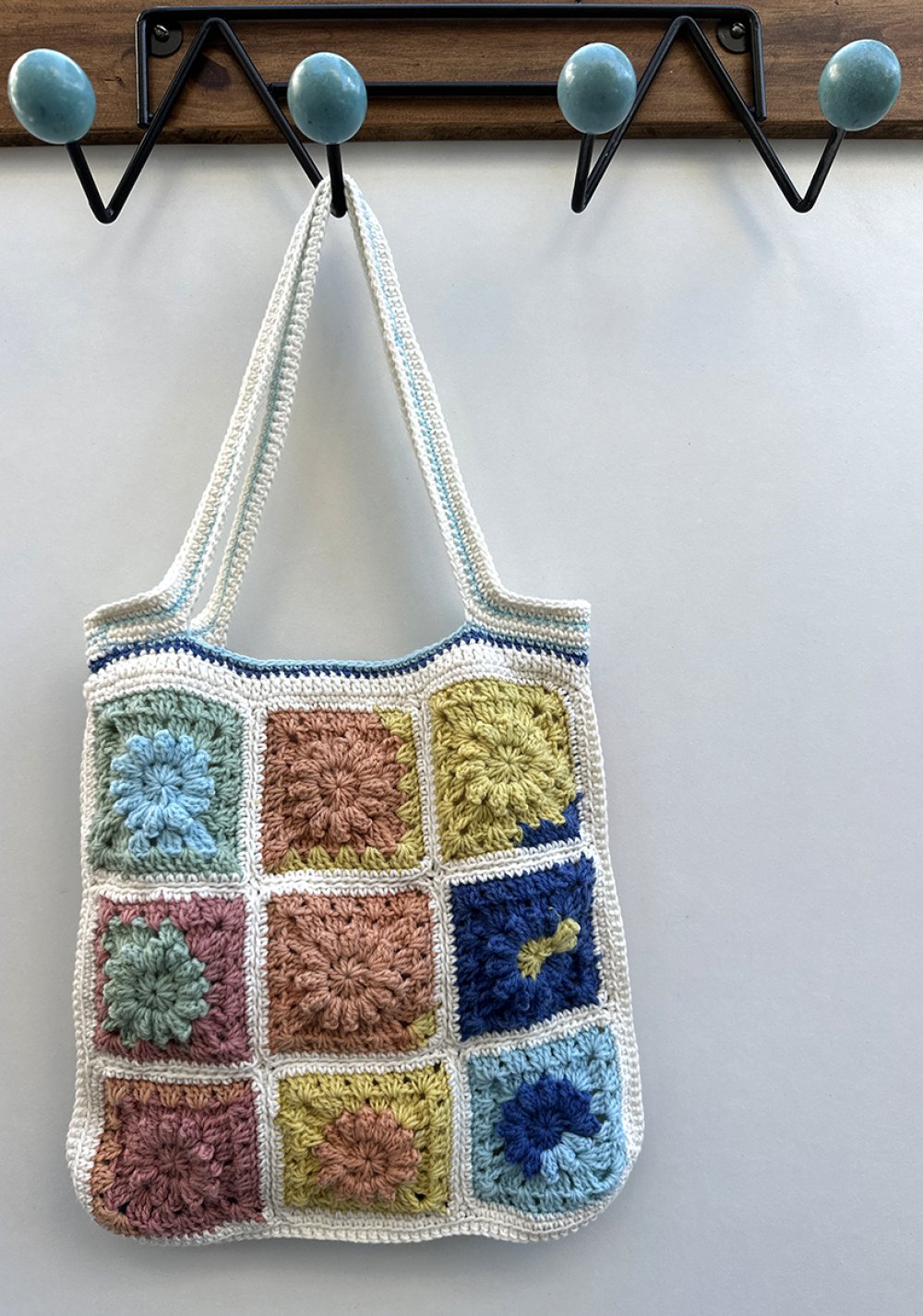 Tote bag au crochet dans un style vintage et bohème, multicolore, tons pastel, idée cadeau pour femme