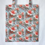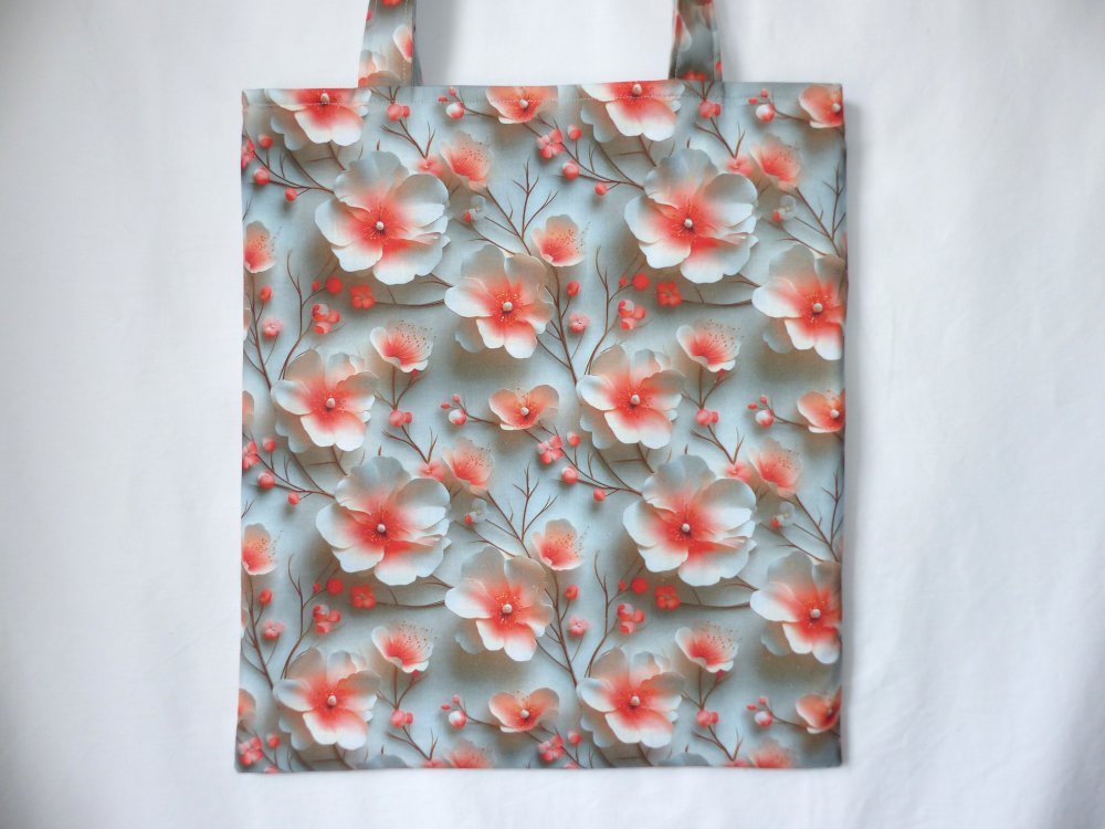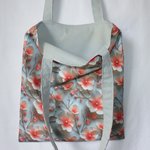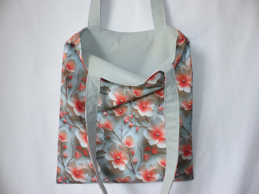 L’extérieur est un tissu fleuri, gris clair et fleurs couleur corail, la doublure est couleur gris clair.