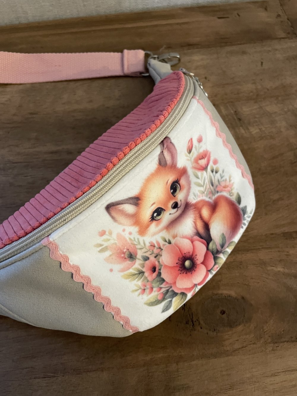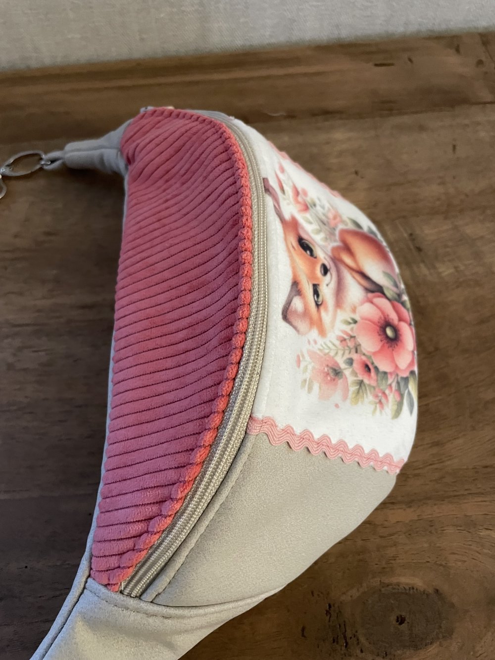Sac banane enfant fait main en tissu simili écru, velours côtelé corail, image imprimé dur velours ras et tissu coton fleuri