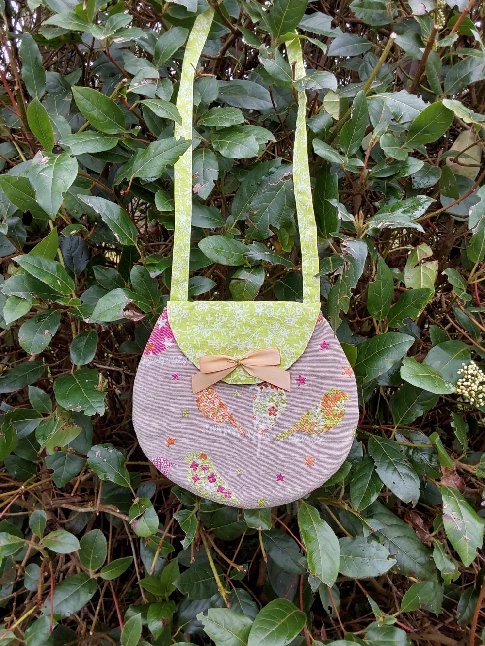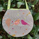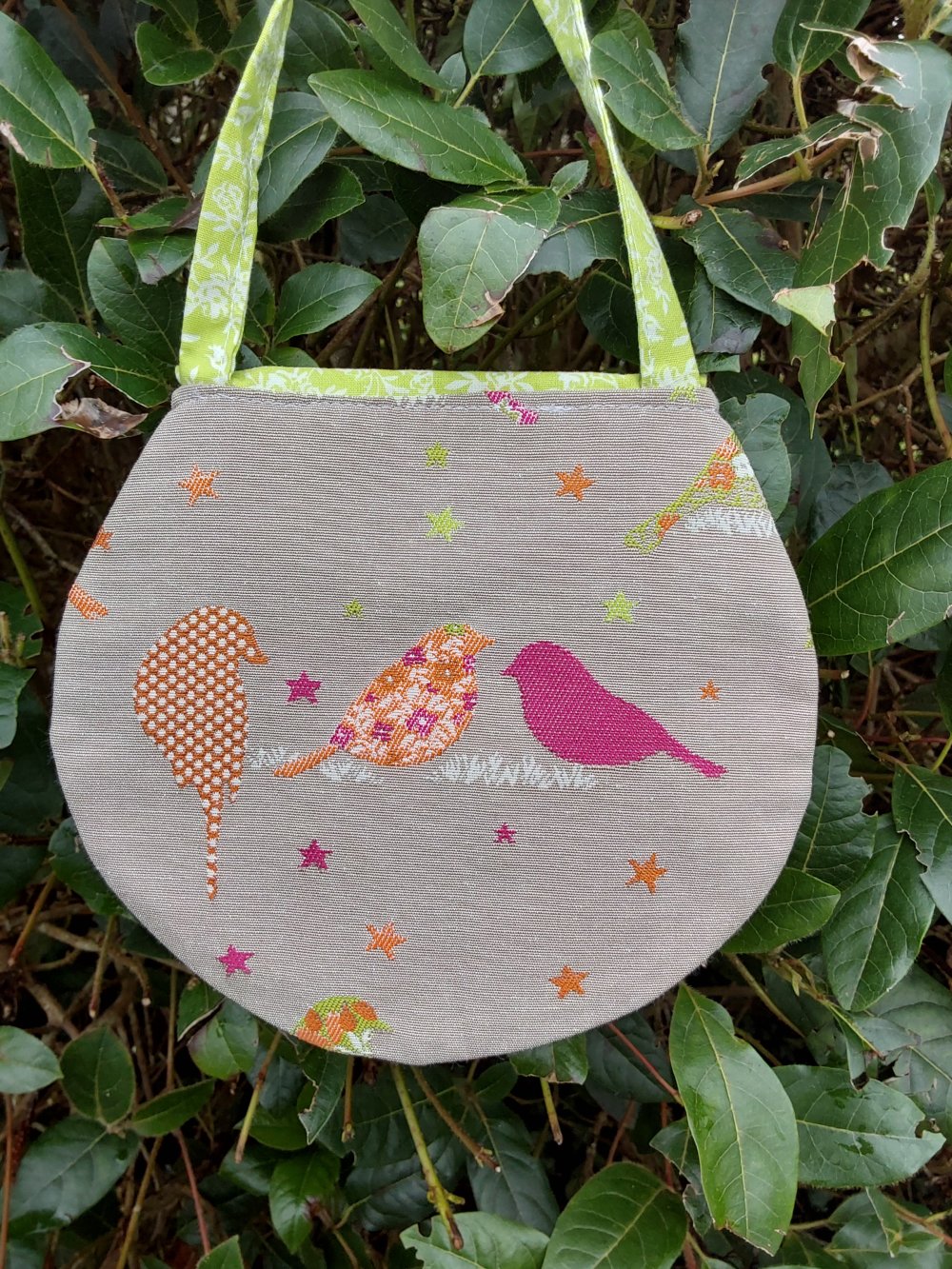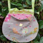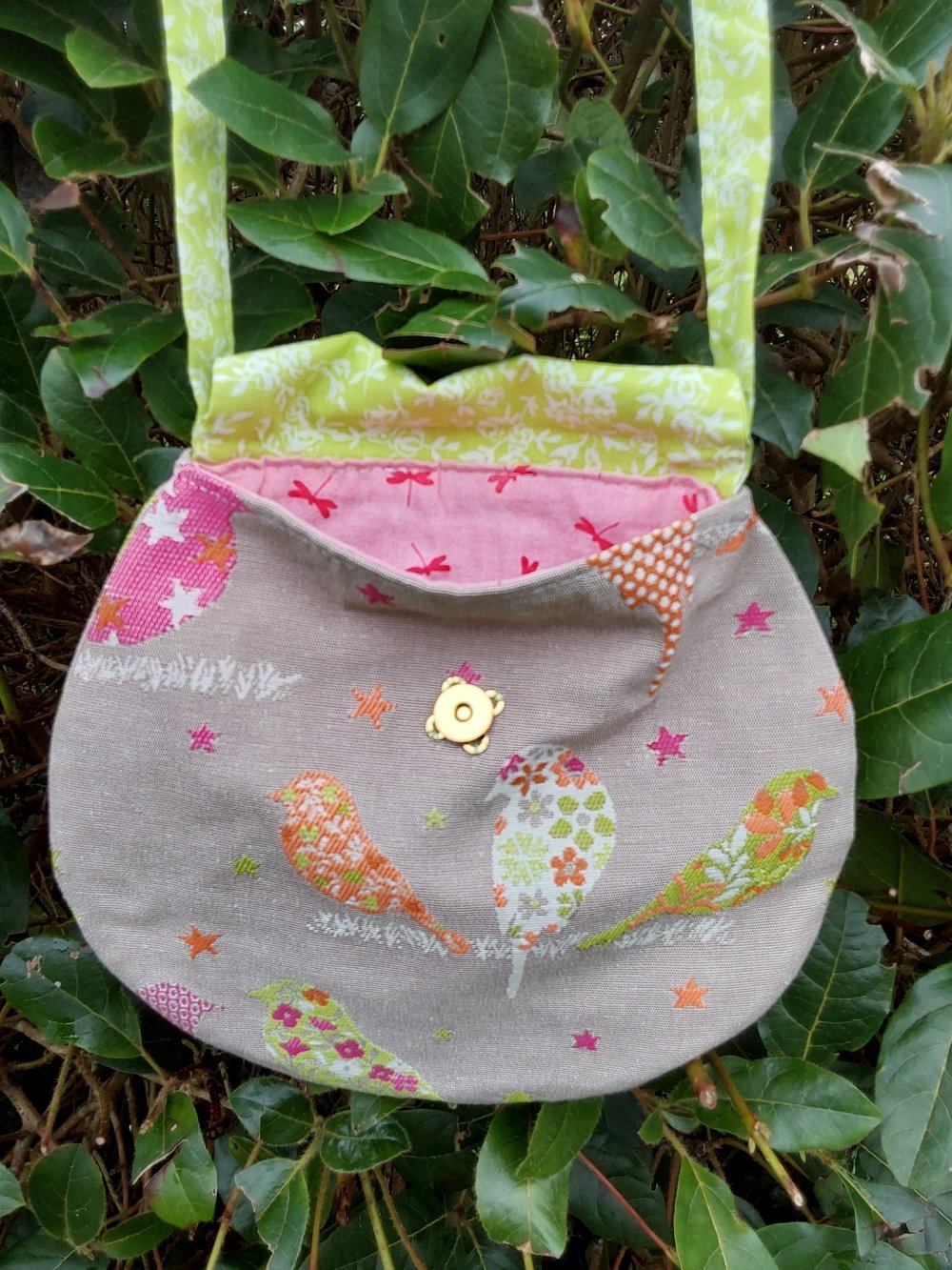 Ce sac est réalisé dans un tissu beige avec plein d’oiseaux, il est doublé d’un tissu rose avec des libellules rouges et se ferme par une pression aimantée.